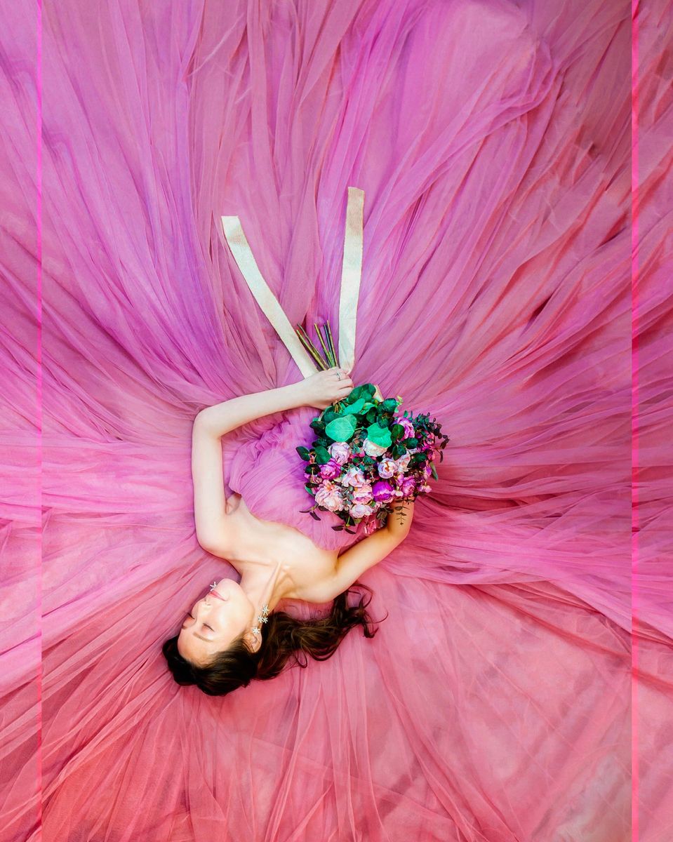 芝生の上で寝転びショットはよく見かけますがもっと高いところから撮影すると自然の中が強調されてより特別な雰囲気に♡