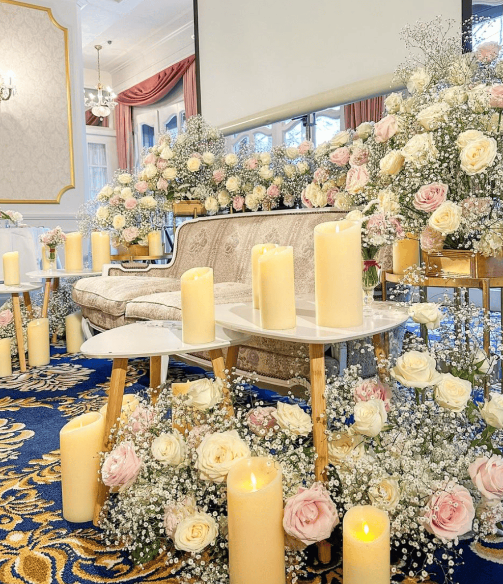 ピンクとホワイトのバラがメインのゴージャスな高砂装花♡