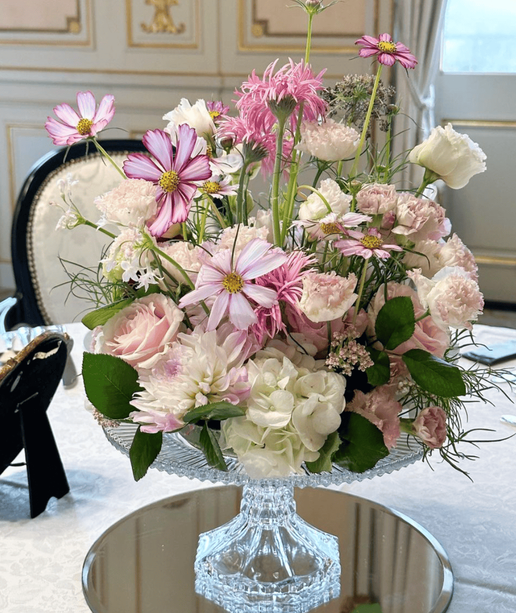 ピンクのコスモスを使った、大人可愛いテーブル装花♡