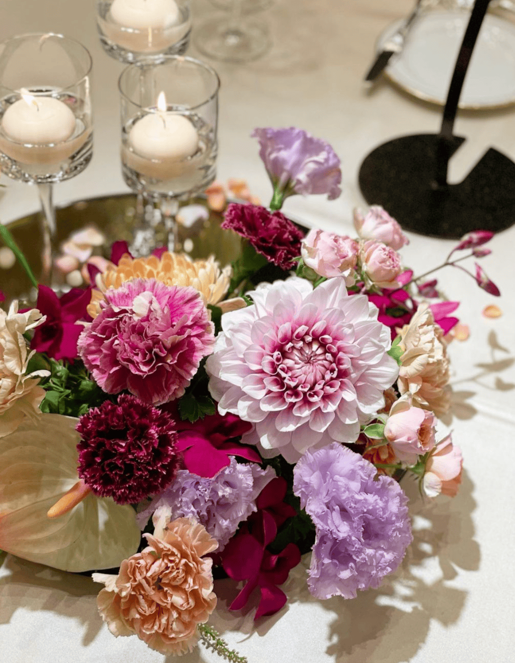 ライトや花びらを使ってちょっと工夫するだけで、他のお花を使わなくてもビシッと決まる♡