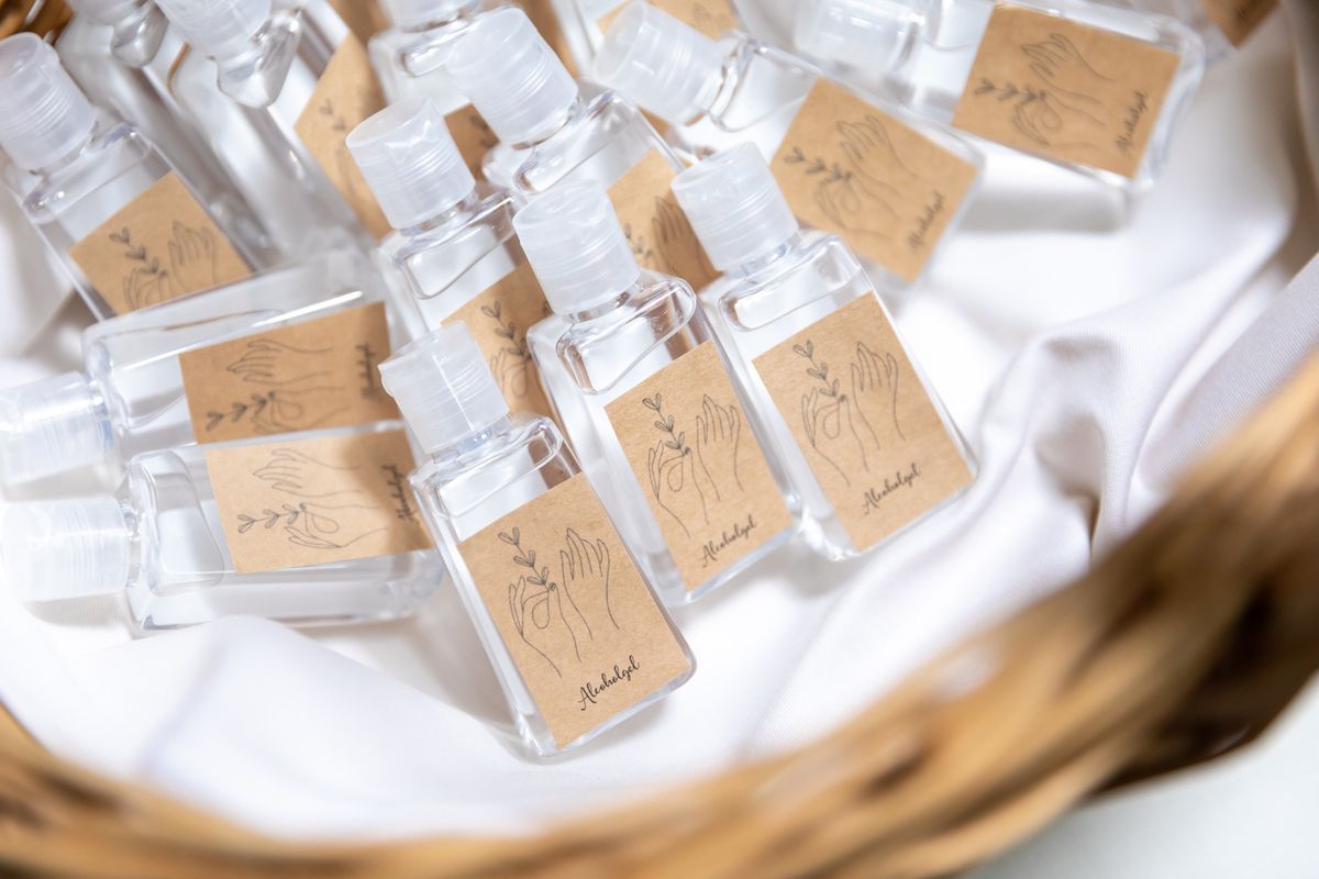 披露宴中も使用できるように、ラベルシールに名前を入れてアルコールジェルを席札にしても◎