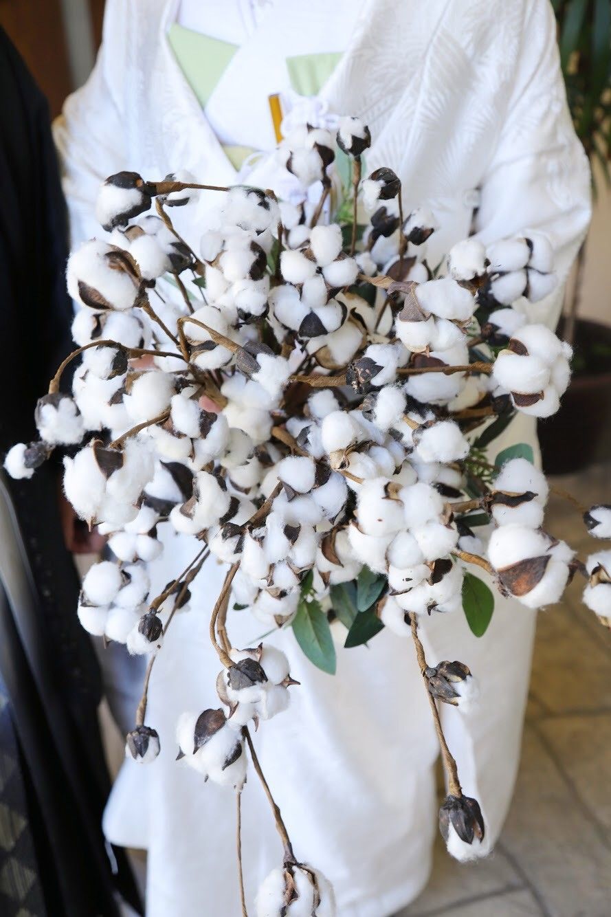 こちらは棉をまとめた珍しいブーケ*枝と葉がアクセントカラーになって、膨張しがちな白を引き締めます。