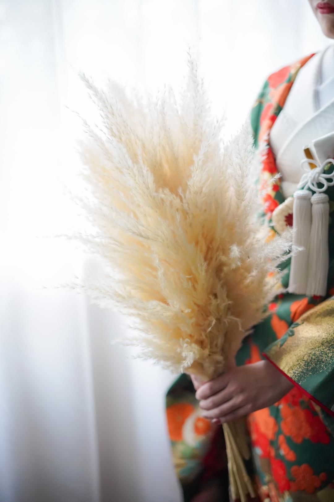 パームフラワーと綿花、パンパスグラス、スモークツリー等、人気の植物を取り入れたブーケ。色味を押さえると色打掛を引き立ててくれます♪