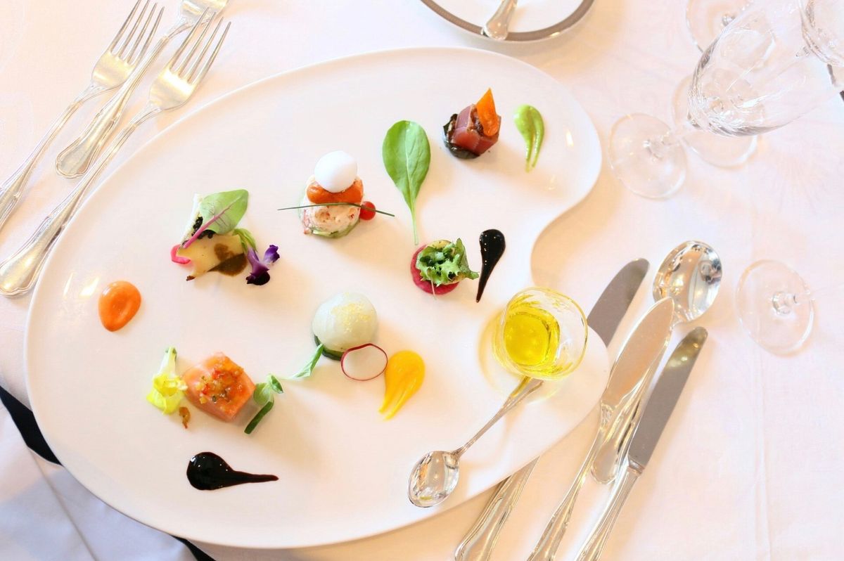 オードブル(前菜)のメニュー内容は、お店によって様々ですが、美しく盛りつけられた様々な料理が1つのお皿に盛りつけられている場合が多いです。