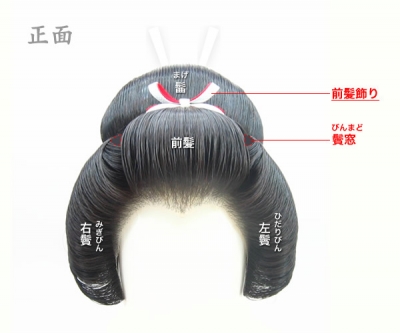 島田髷に限らず、すべての日本髪が正面から見ると「前髪」「髷(まげ)」「右鬢(びん)」「左鬢(びん)」で構成されています。