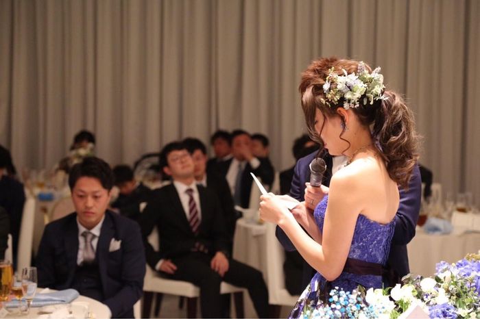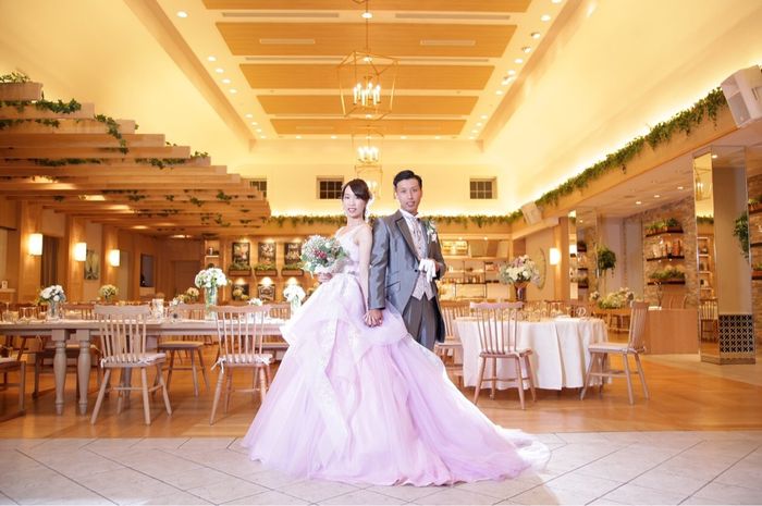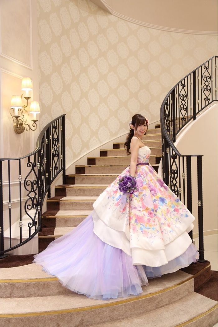 こちらは色違いのラベンダーカラー。先輩花嫁さんは大人可愛く、お色直しで登場した時にインパクトが残るものをイメージした結果、このドレスになったとのこと。アクセサリーはドレスに合うように、かつキラキラを忘れないように選んだそうですよ♡
