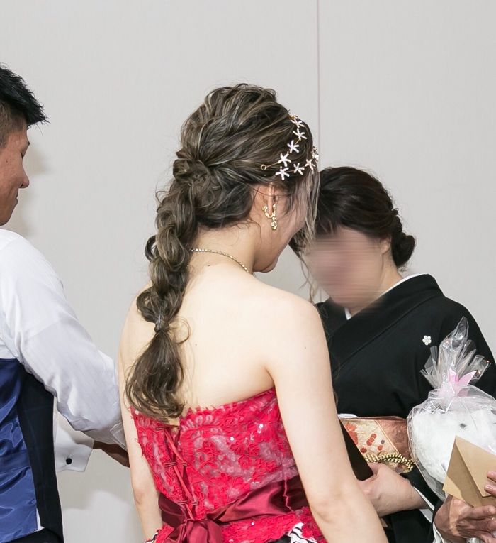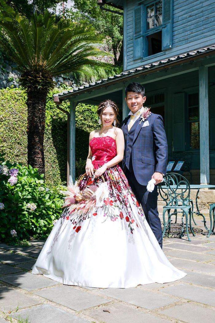 こちらは色違いの深い赤色のドレス。華やかな色合いでありながら、スカートの半分は白いため、色を程よく中和してくれています。先輩花嫁さんは絶対にハーディエイミスと決めていたようで、普段とのギャップを演出するためにこのドレスを選んだそうです♪