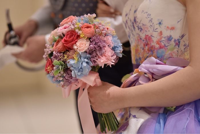 ブーケはピンクでとにかく可愛く、とオーダー。結果ピンクをメインとしながらも、紫やブルーを混ぜることでドレスとの相性もばっちりになりました!