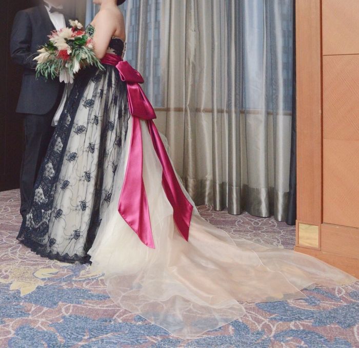 画像のバックリボンにプラスして、フリルのついた長いバックトレーンをつけて楽しむこともできますよ*