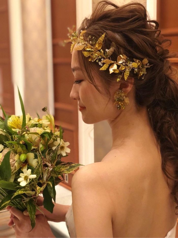 髪はダウンスタイルにゆるくまとめてカジュアルな雰囲気に。ヘッドドレスやピアスもリーフモチーフのものに統一していて、きれいにまとまっています♪