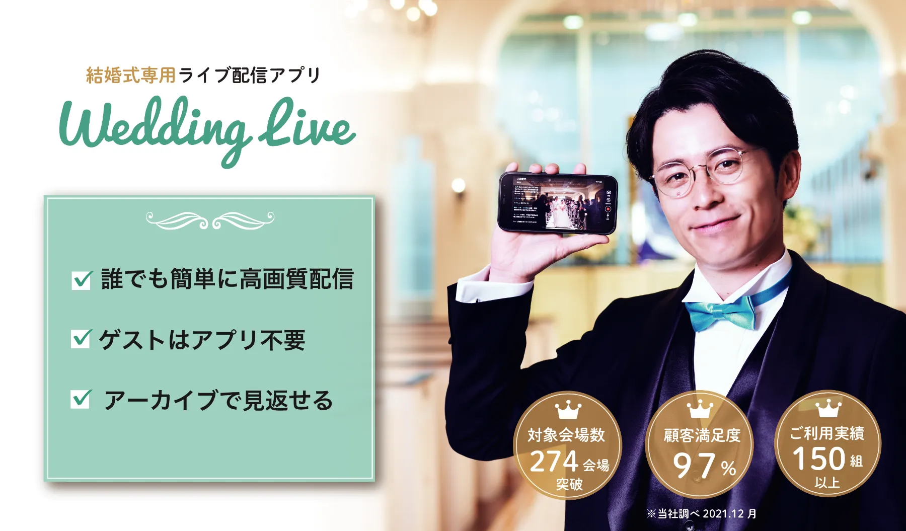 Wedding Liveは、結婚式専用のライブ配信アプリ。スマホ1台で配信できて、ゲストは招待URLにアクセスするだけで簡単に視聴できます。