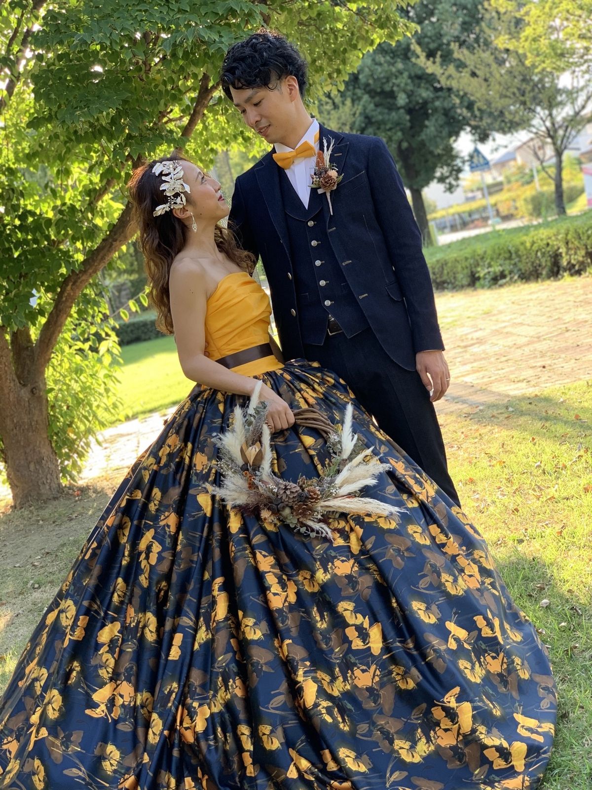 黄色と反対色のネイビーの組み合わせが印象的で華やかなドレスです。