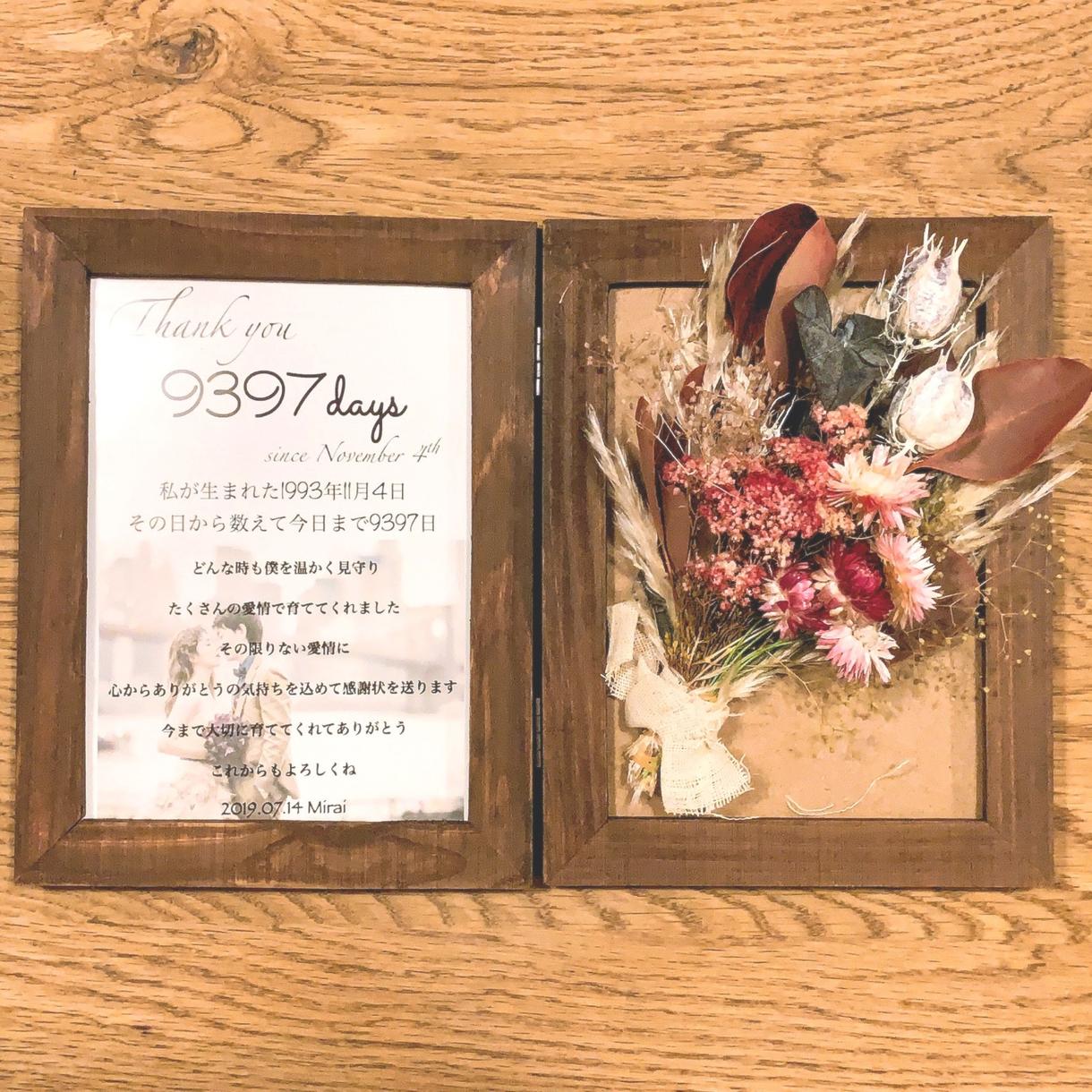 生まれてから当日までの日数とメッセージ、写真が入れられる両親感謝状。