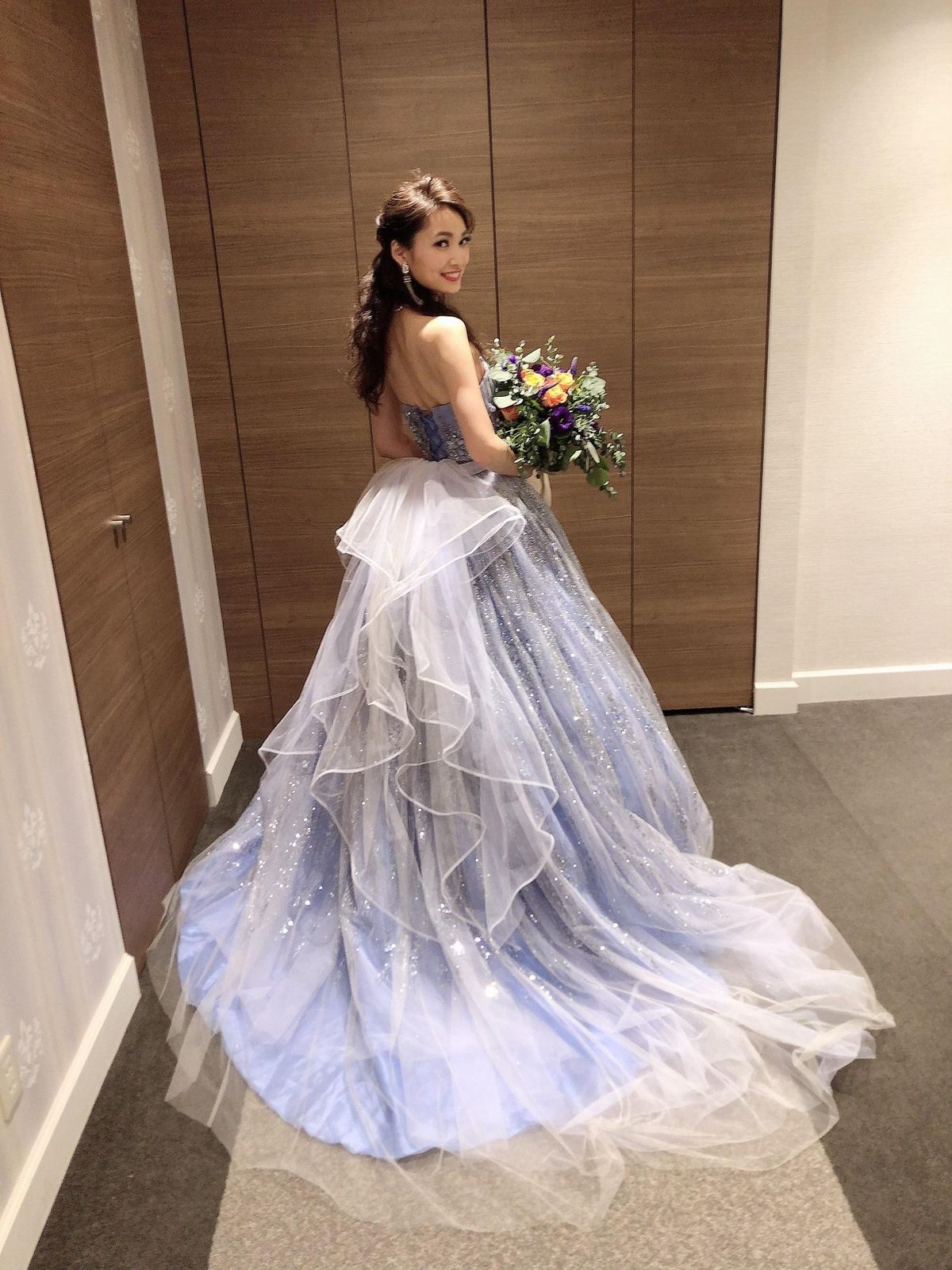 照明やカメラによって、濃いブルーや淡いブルー、パープルにも魅せてくれるドレスだそう*