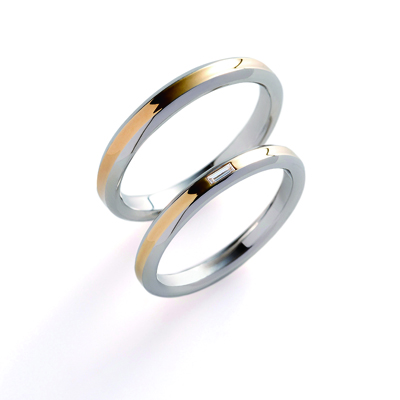 シンプルですっきりとしたデザインですが、プラチナとイエローゴールドを組み合わせることで個性的な印象を与えてくれます。レディースの中央にセッティングされたダイヤもリングに合わせた四角形で、華やかさをプラスしながらも洗練された雰囲気が楽しめますよ*