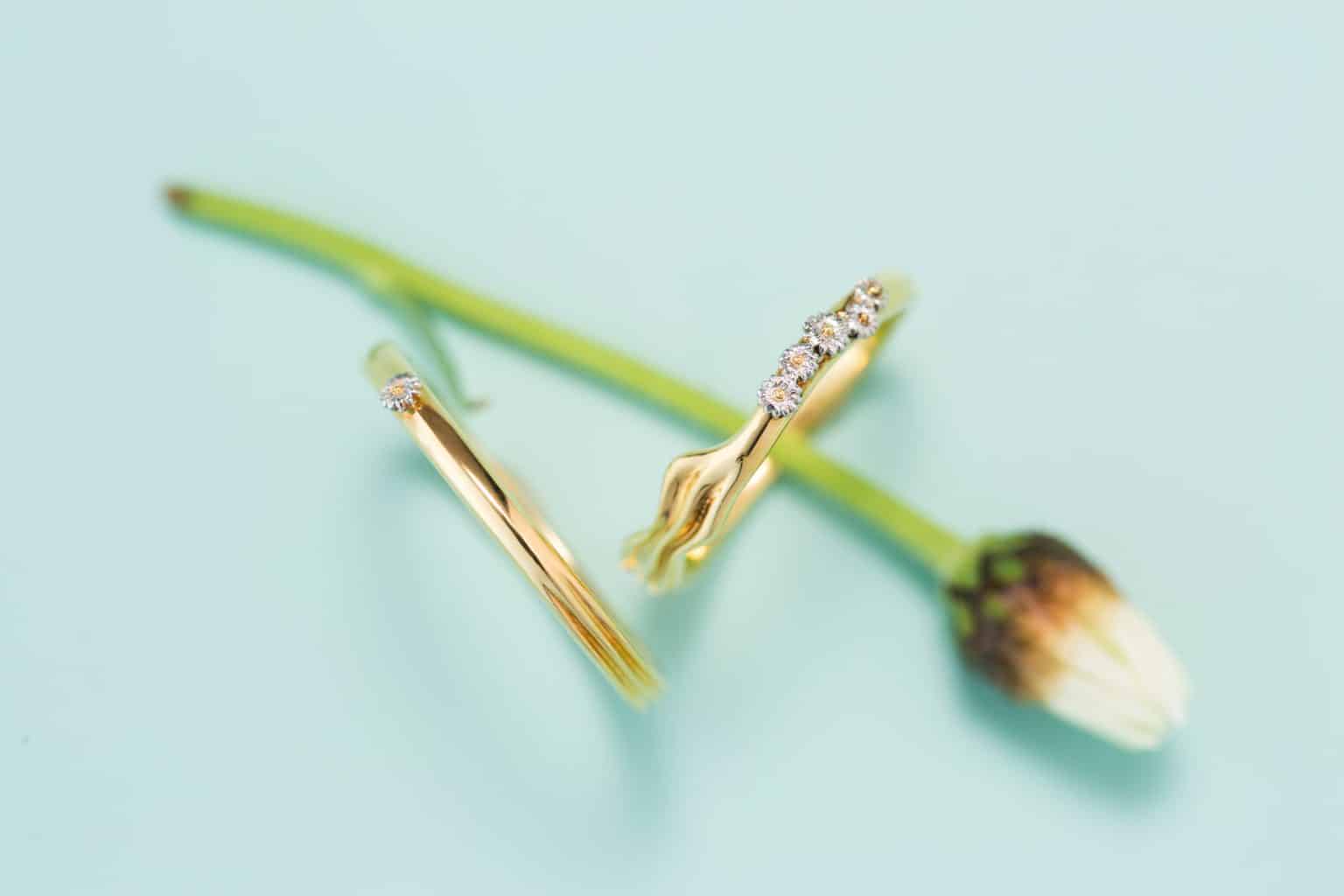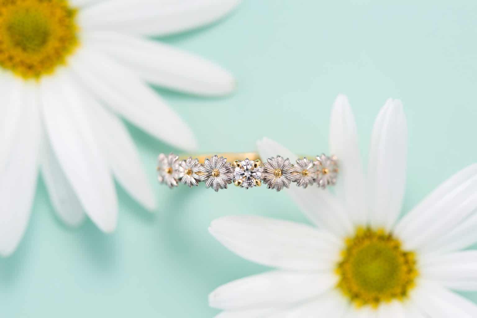 レディース用はゆるやかにカーブしたリングに花々を散りばめた、お花畑のようなデザイン。