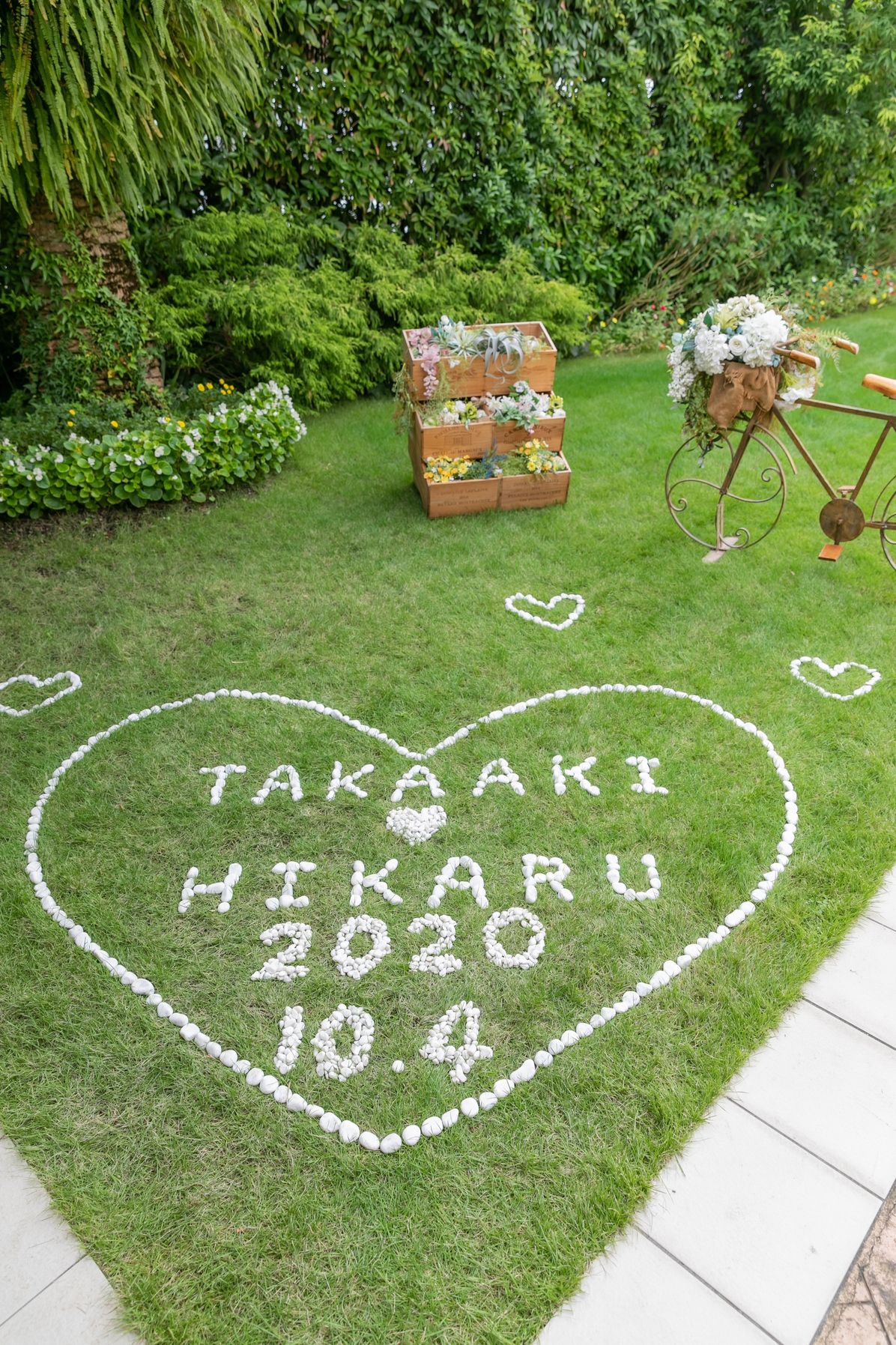 白い石で芝生に新郎新婦と結婚式の日付を描いた思い切りの良いダイナミックな装飾♡
