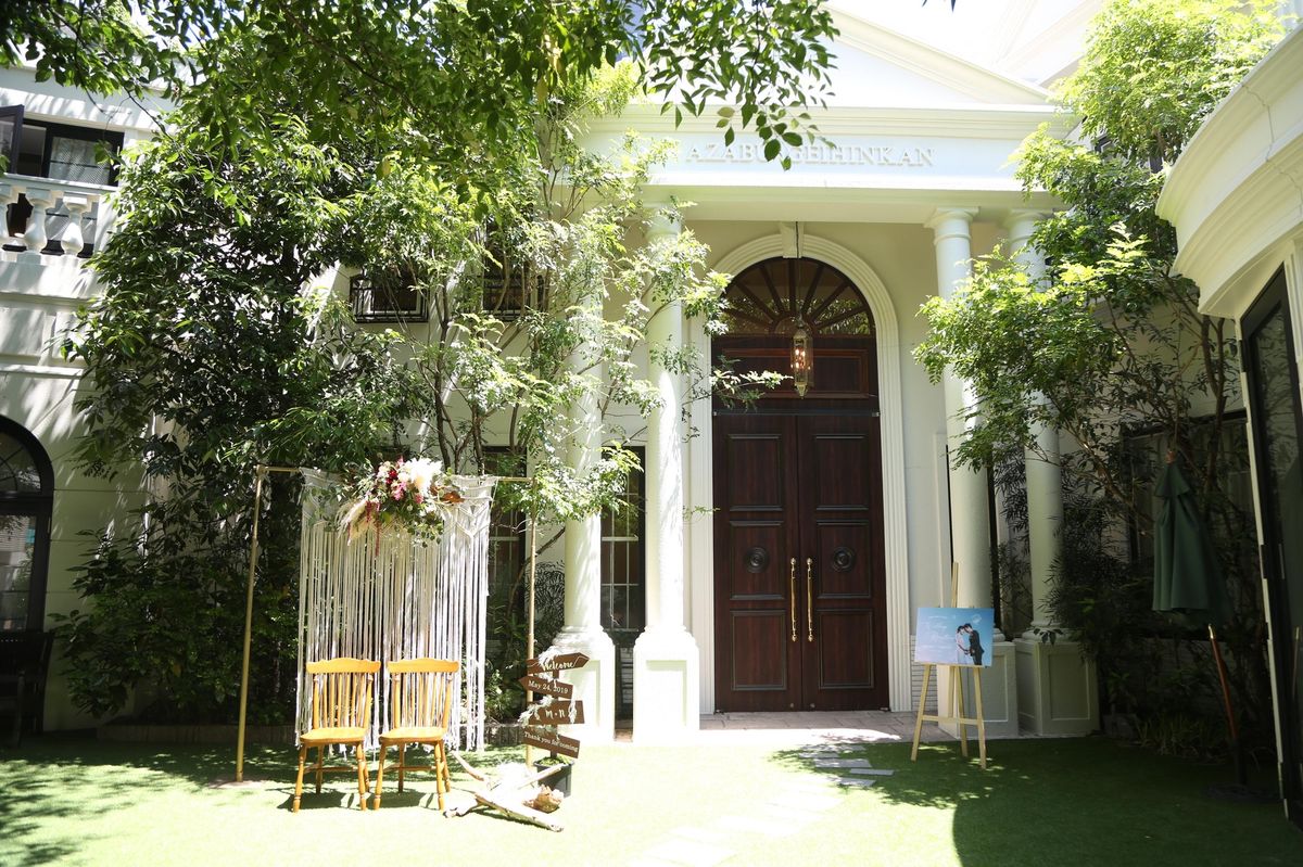 式場の白い建物に背の高い木々、そしてさりげなく置かれたナチュラルテイストのチェアは、まるで海外のパーティー会場のよう♡