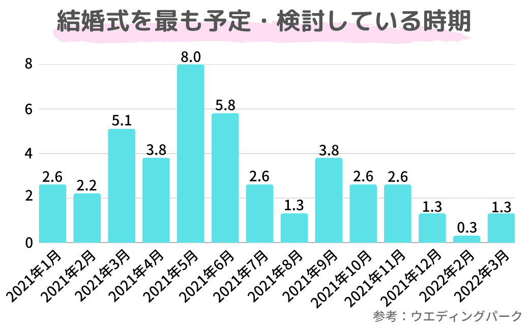 ウェディングパークが実施した「新型コロナウイルス流行中の結婚式場探し」に関するアンケート調査で明らかになった、プレ花さんたちが結婚式を予定している時期はこちら*
