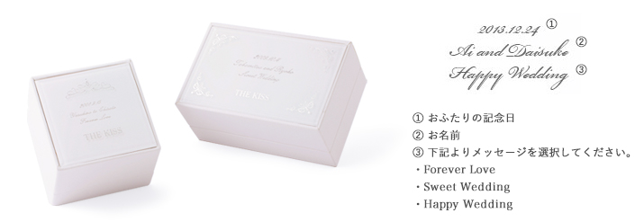 くまのプーさんがデザインされた専用のジュエリーボックスに、おふたりの記念日やお名前、メッセージを刻印してもらえます。こんな可愛いボックスで指輪を持ち帰れるなんて嬉しいですね!