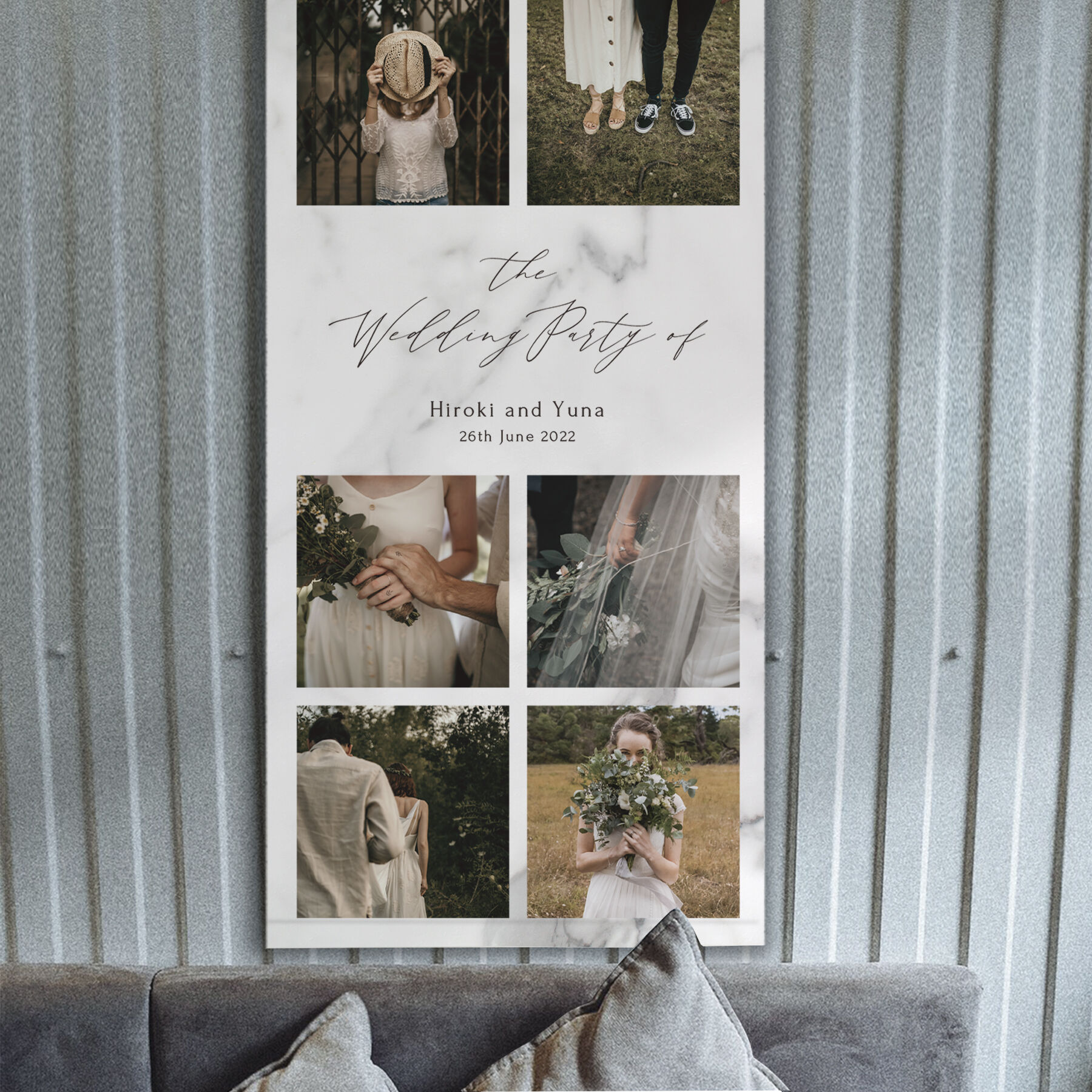1枚の写真を大きく引き伸ばすのも、もちろんインパクトがあって素敵ですが、前撮り写真がたくさんあるという方や今までの思い出の写真をタペストリーにしたい方は、複数枚の写真をコラージュ風にしてタペストリーにする方法もあります♪