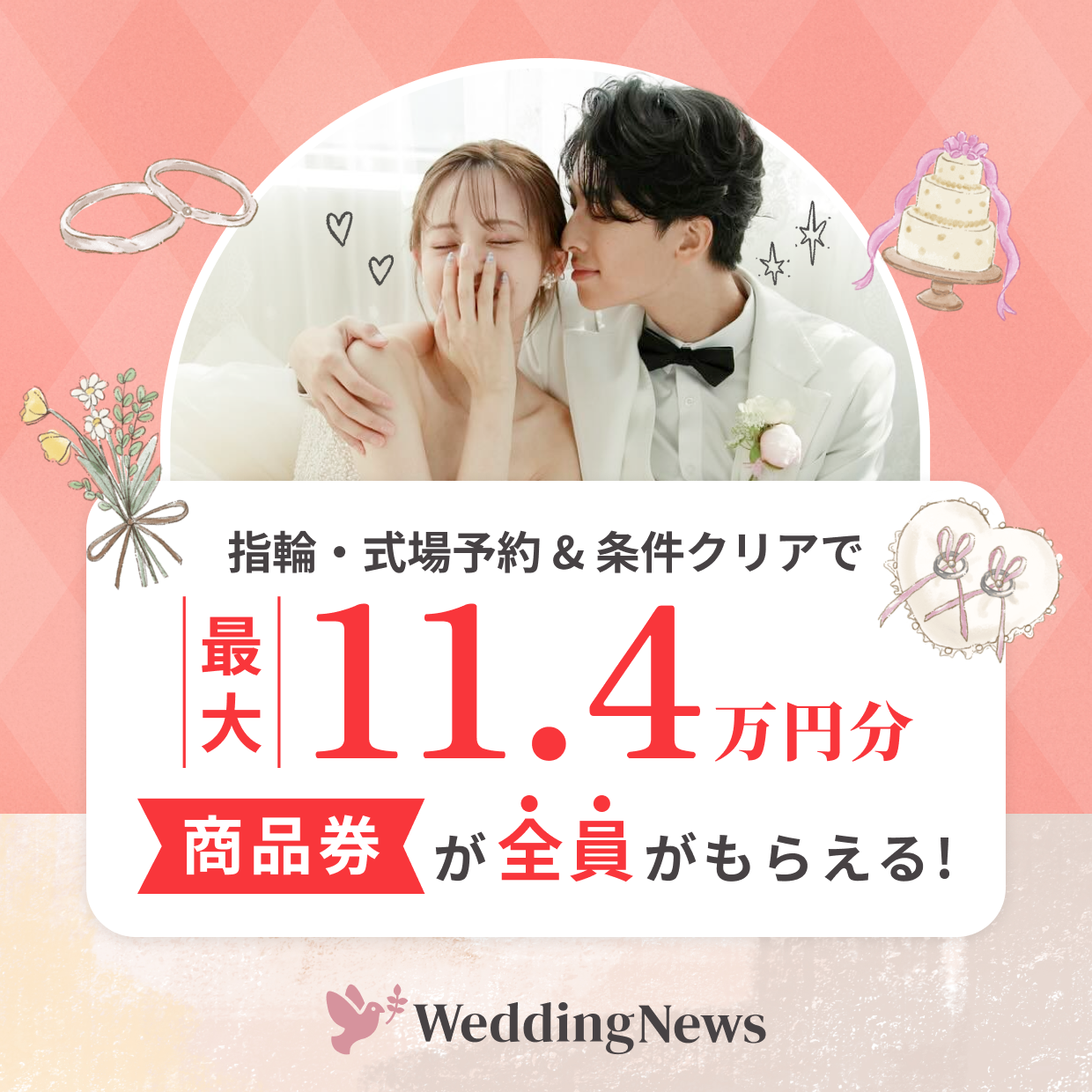 ウェディングニュースのGotoウェディングキャンペーンでは、式場や指輪ショップに来店・成約すると、最大11.4万円がもらえるキャンペーンを実施中です😊
