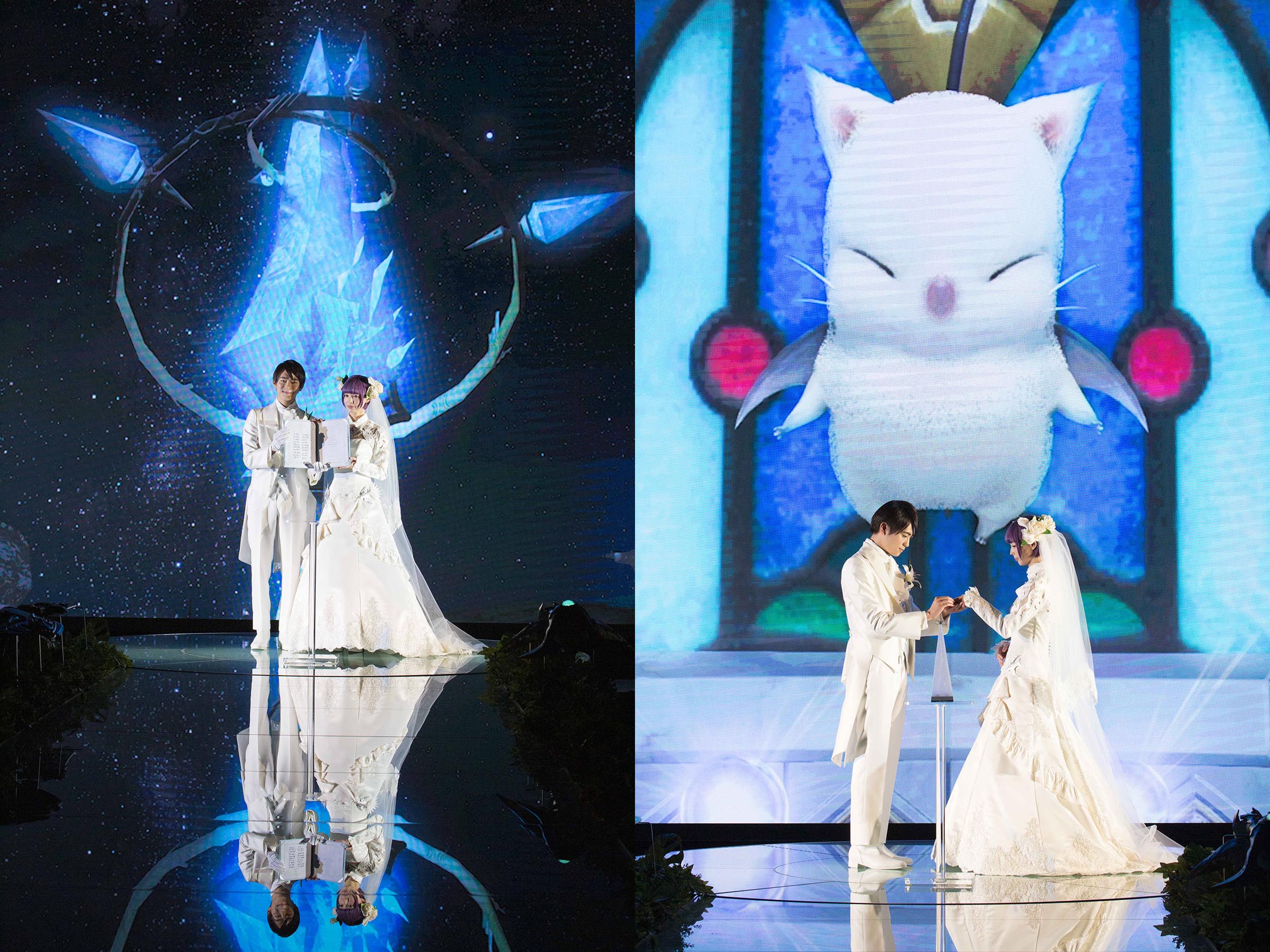 新郎新婦の衣装は、ゲーム内のエタバン衣装と同じデザイン。会場内にはおなじみのキャラクターやアイテムモチーフの装飾など、FF14にまつわる演出がたっぷりと取り入れられています。