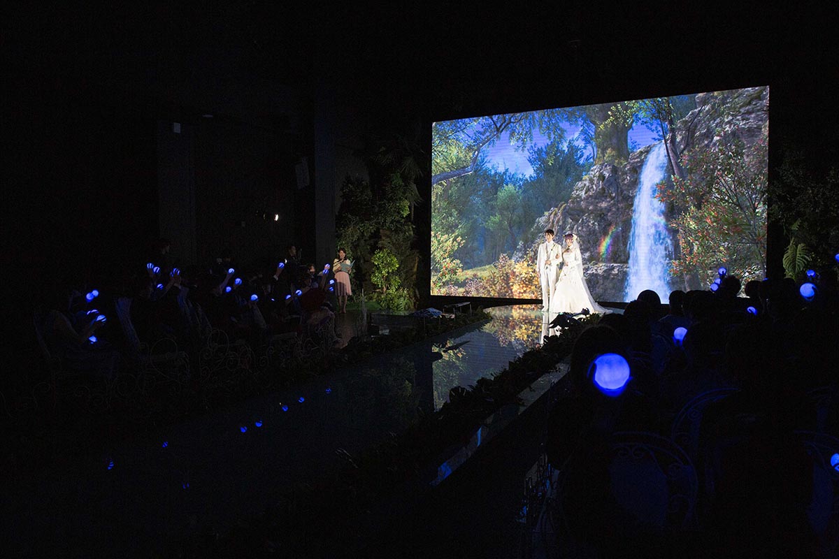 FF14ウェディングでは、ゲーム内でおなじみのエオルゼアの美しい光景が壁一面に映し出されます。