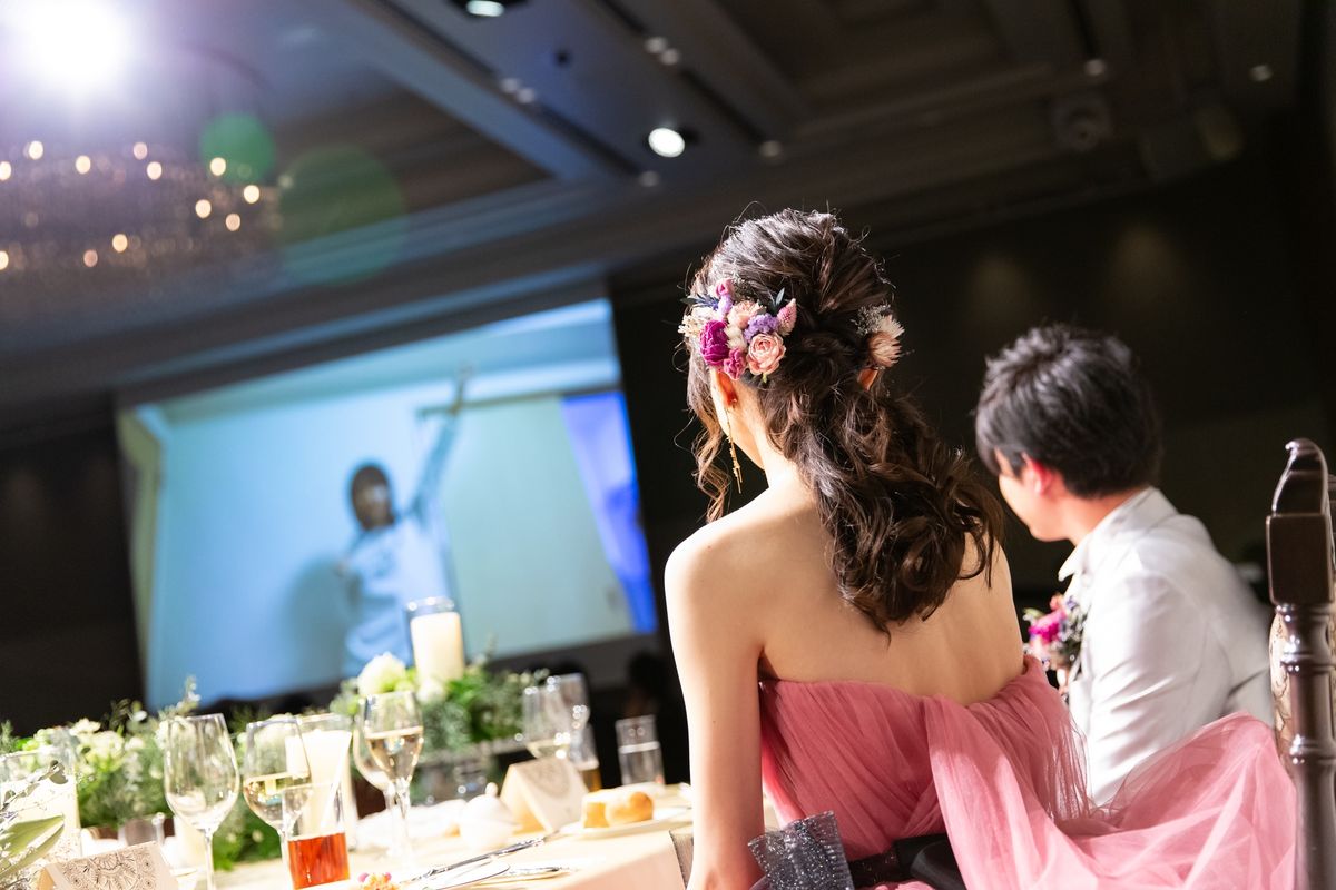 先ほど演出ムービーとして「エンドロールムービー」を挙げましたが、当日の式の模様を撮影しその場で編集してエンドロールとして上映する「撮って出しエンドロール」形式も人気です。こちらは当日の記録ムービーを撮影しつつ、演出ムービーとしても使用する形になります。