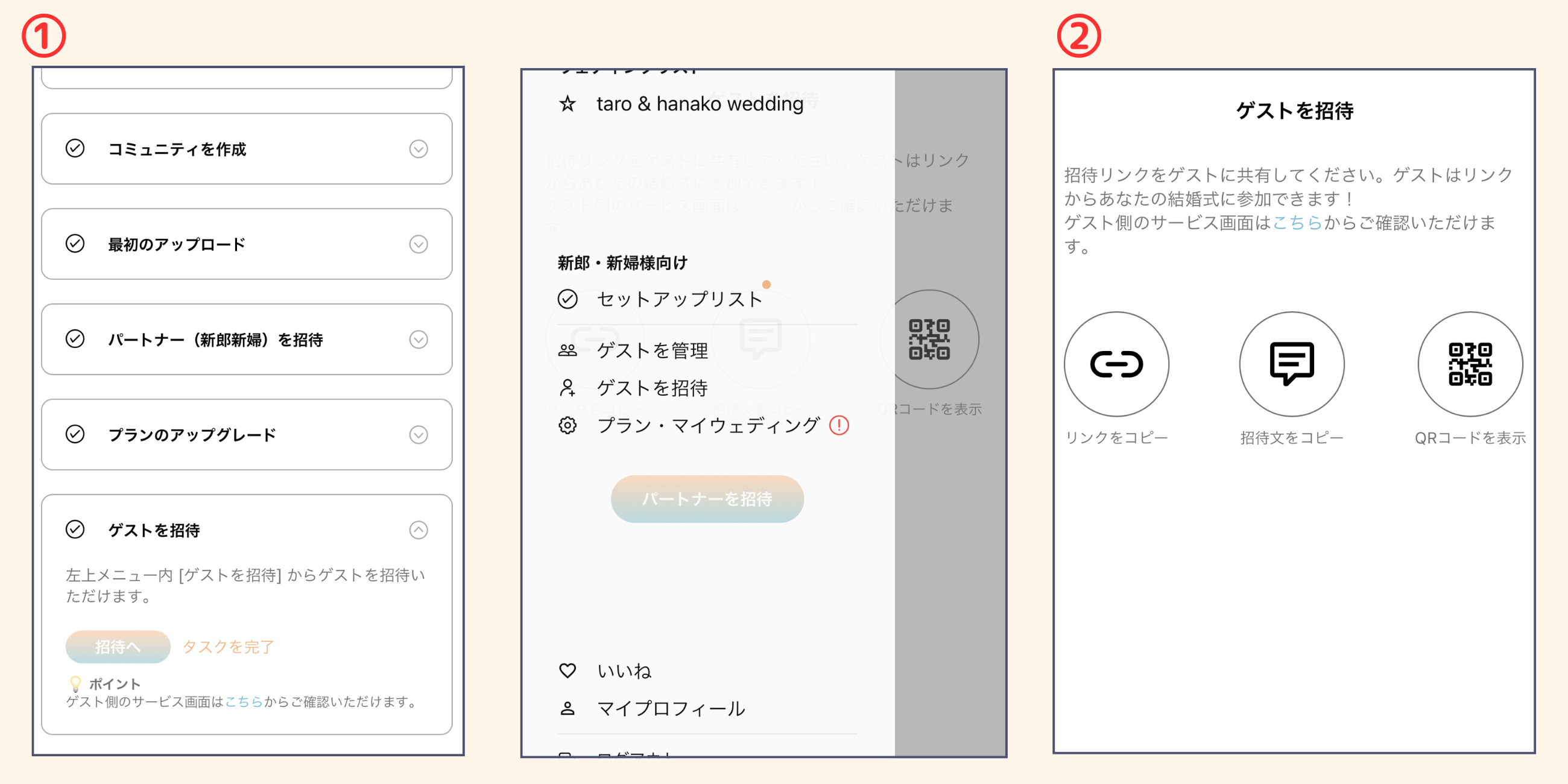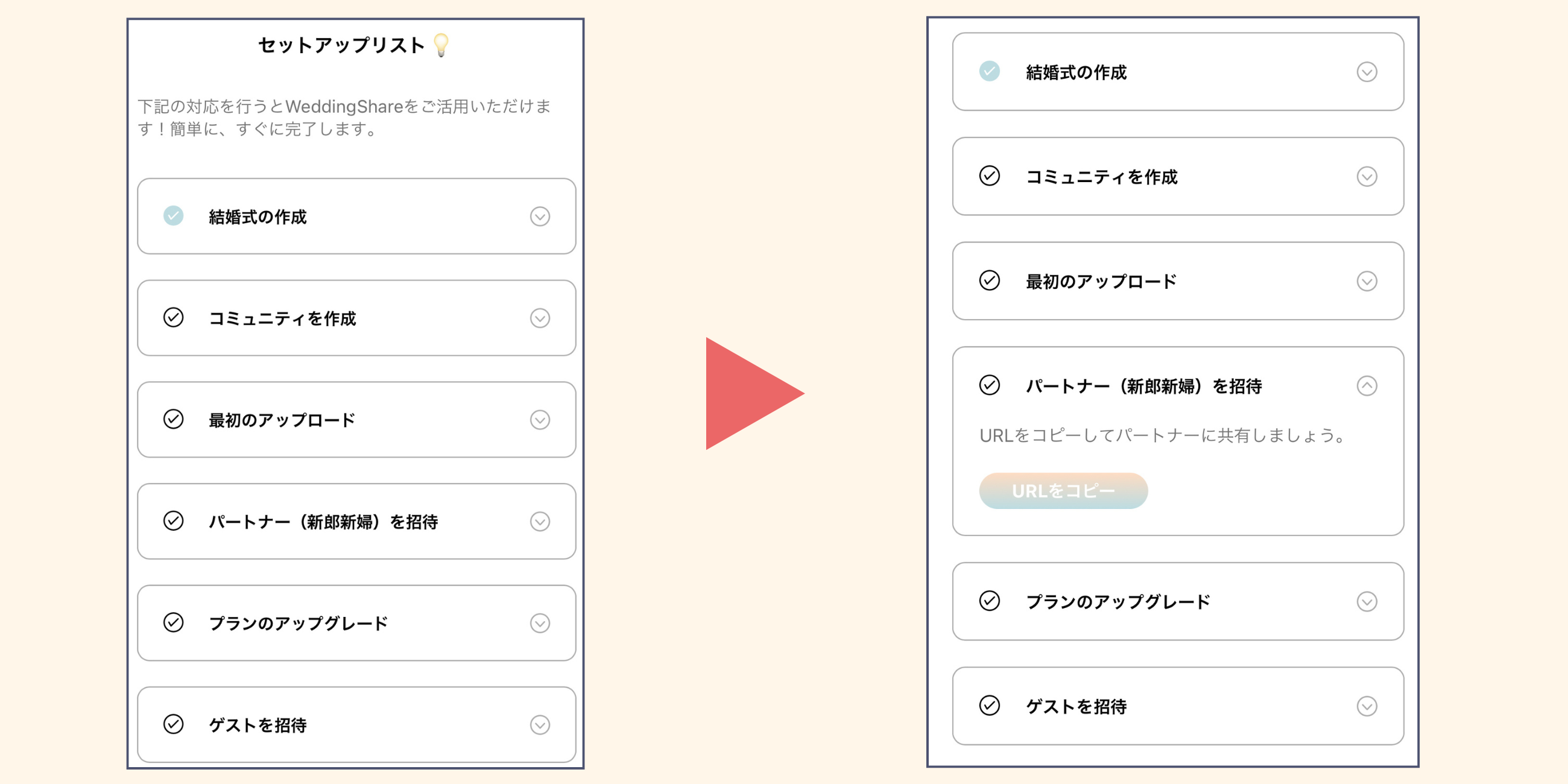 登録が完了すると、セットアップリストが出てきます。そこから「パートナー(新郎新婦)を招待」を押すとURLをコピーするボタンが出てくるのでタップ!