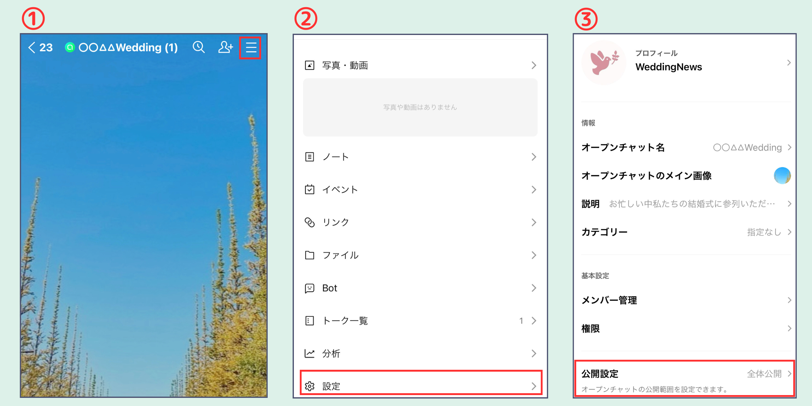 オープンチャット設定画面に移るので、「公開設定」を押します。