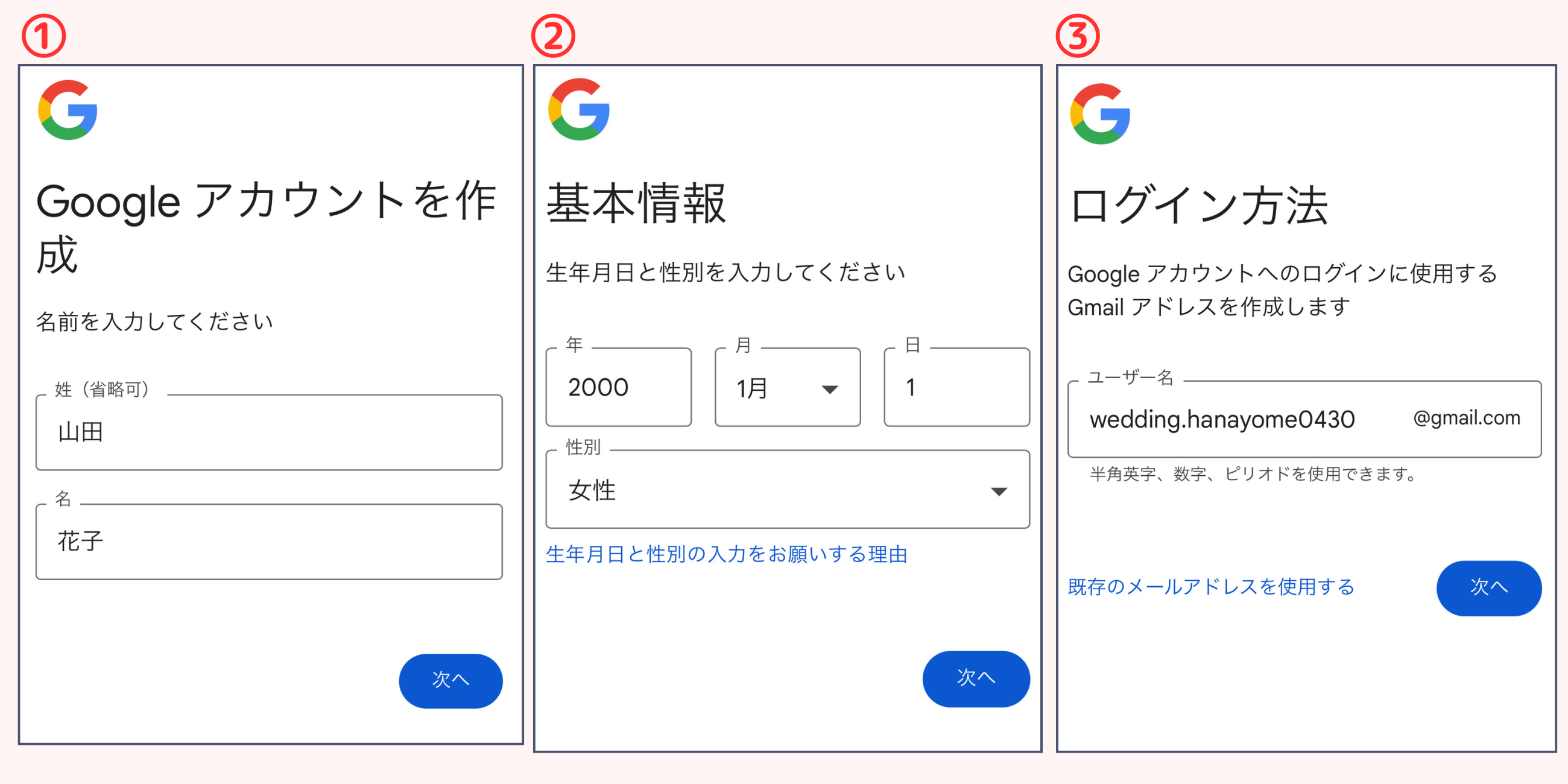 Gmailのアドレスを作成します。使えるのは「半角英語」「数字」「ピリオド」の3種類。すでに使われているアドレスだと作成できないので、2人の記念日などオリジナルの英数字を入れると◎