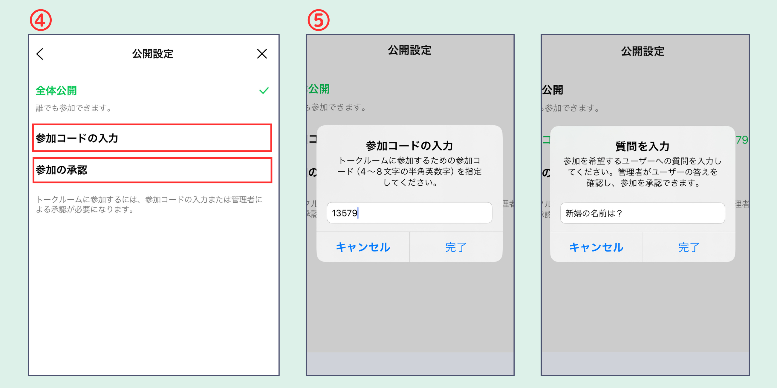 参加コードの場合は、自分が設定した「参加コード」を知っている人だけ参加できます。参加の承認の場合は、自分が設定した質問にゲストが回答し、さらに管理者に「承認」された人だけ参加できるシステム。