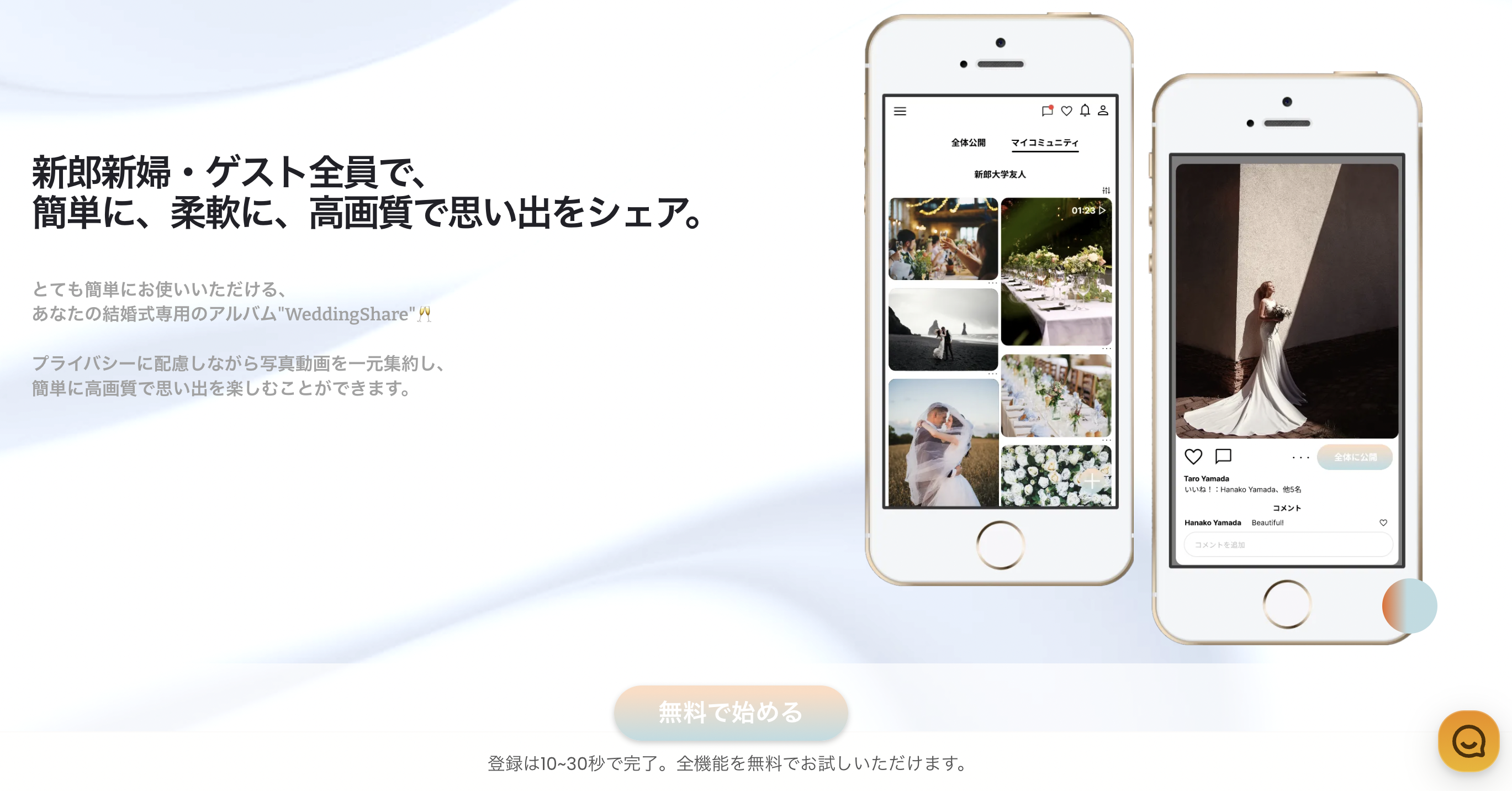 一番の魅力は、LINEやGoogleフォトのような専用のアカウントが不要なこと。名前の非表示機能(ニックネーム機能)や、コミュニティ限定で公開ができたりなどゲストのプライバシーに配慮しながら写真や動画を一元管理できます!