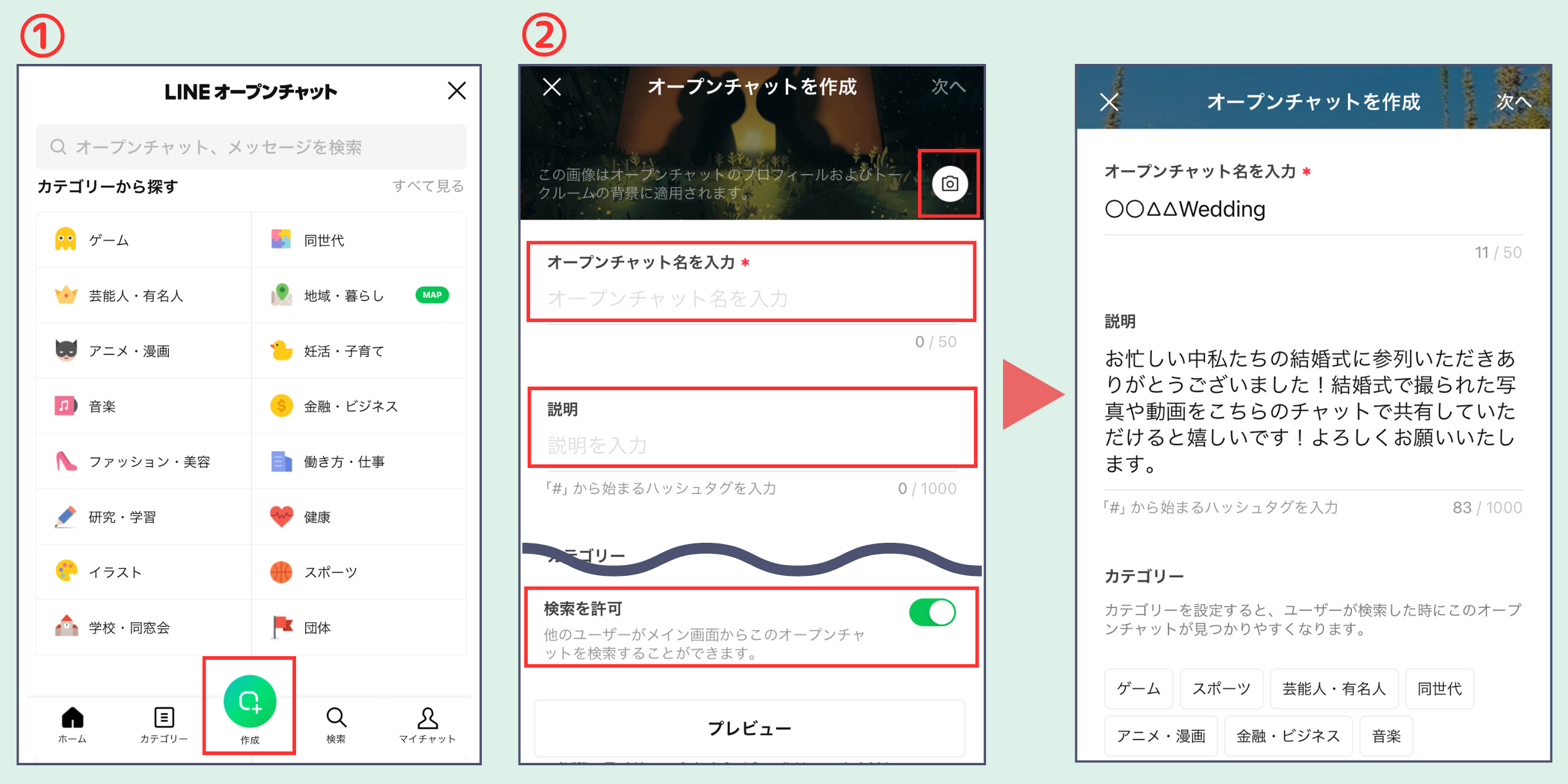 ②メイン画像・オープンチャット名・説明・検索を許可を入力