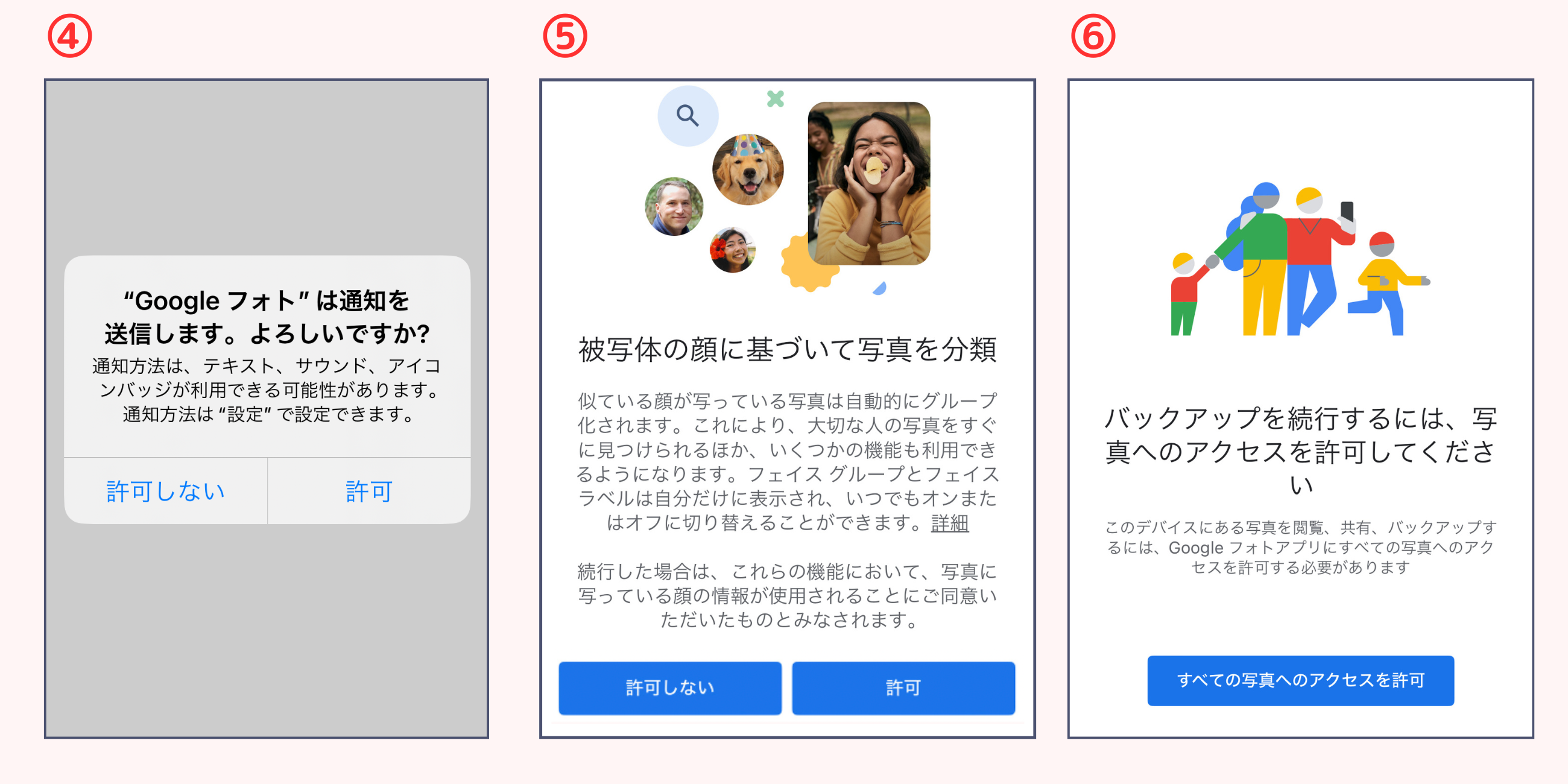 Googleフォトは顔を認証して自動でグールプ化してくれます。ゲストごとにまとめてくれるので許可するがおすすめ!もちろん、不要であれば許可せずに進んでも問題ありません。
