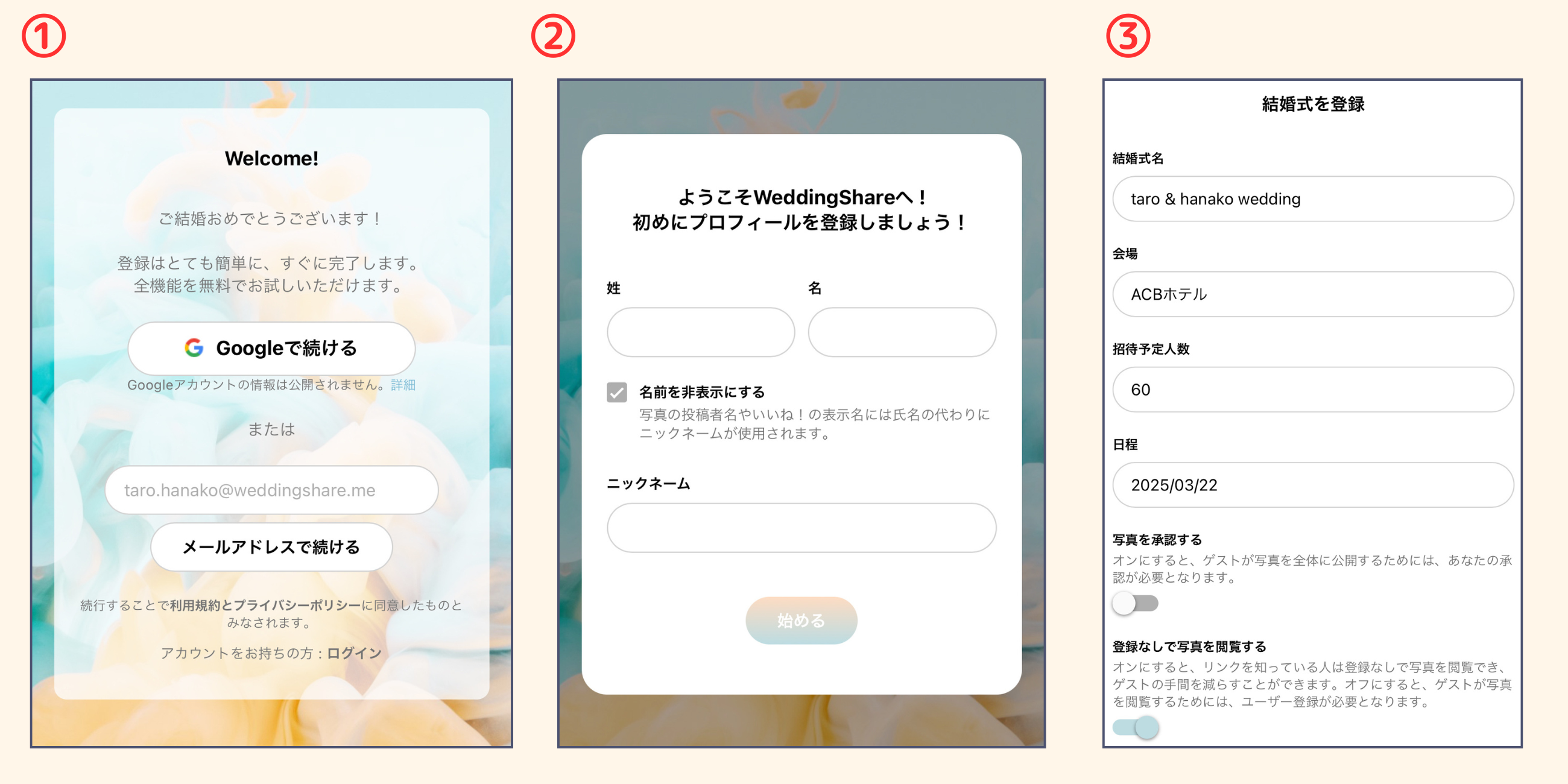 名前もしくはニックネームを登録します。Googleアカウントを連携した場合は自動でアカウント名が入力されますが、変更も可能です。新郎新婦はゲストにわかりやすくするため、名前で登録するのがおすすめ。