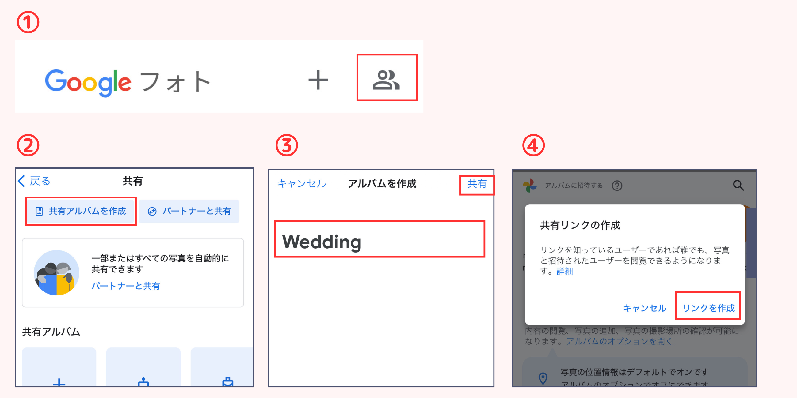 これでGoogleフォトで、結婚式用の共有アルバムとゲストへお知らせする用のリンクが完成です!