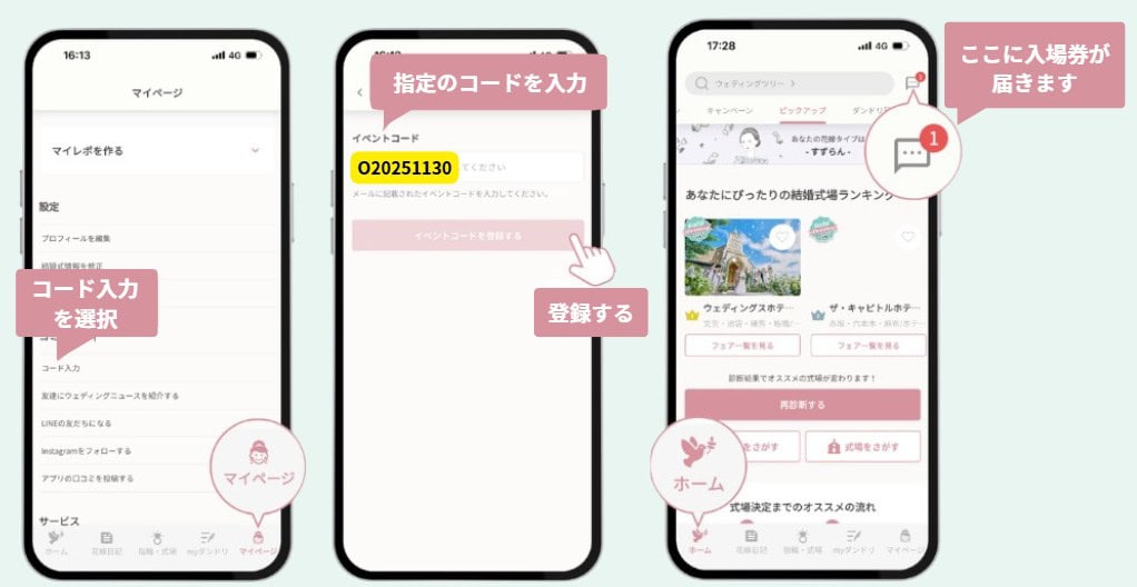 イベント当日、各ブランドブースにて指輪相談・試着後、その場でショップへの来店予約をすると1回抽選できます。3つのショップの来店予約をされた方は3回抽選ができます。