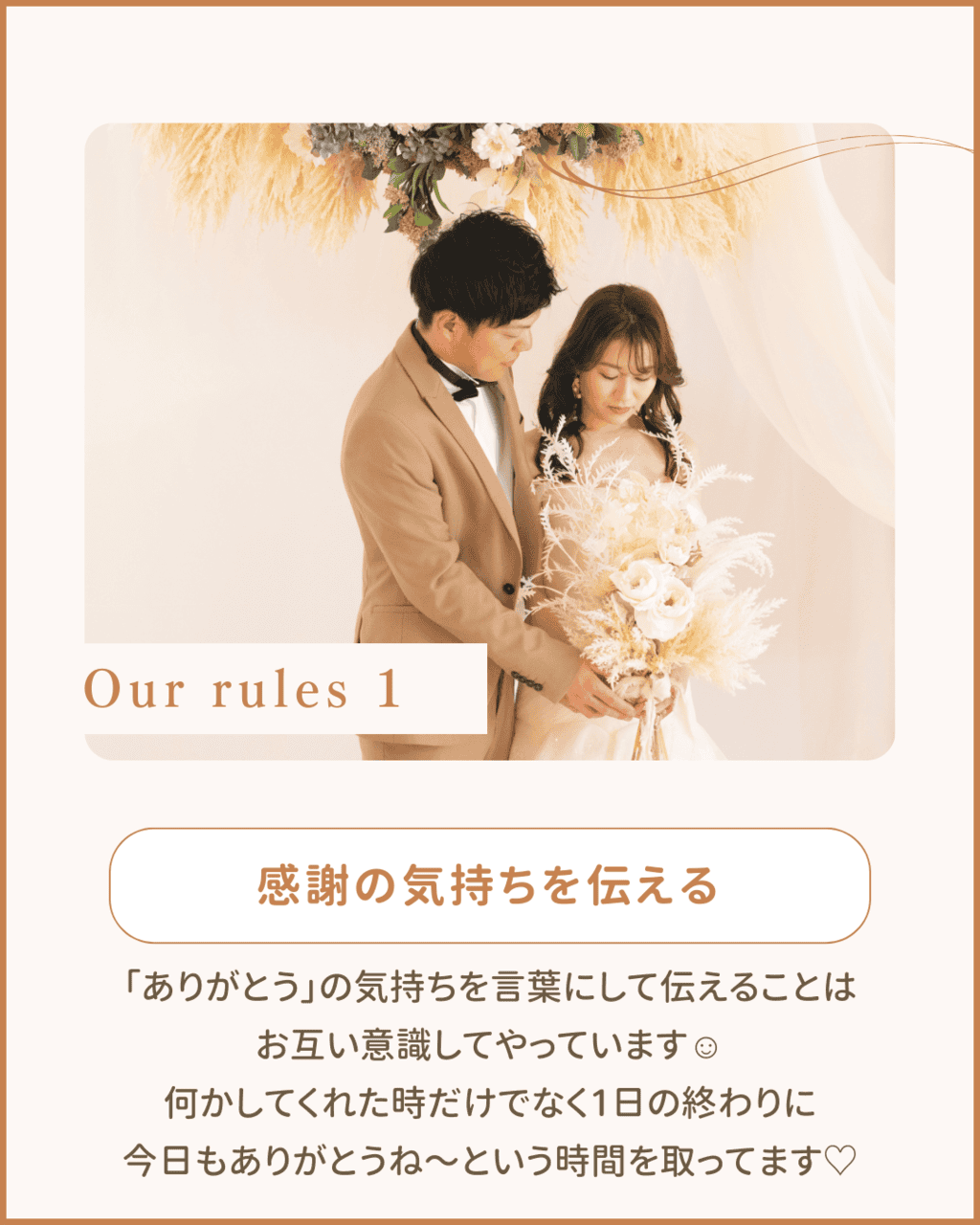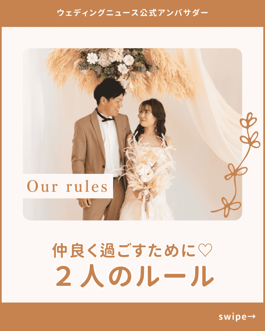 最後は、2人で決めたルール♡新しく人と一緒に暮らすのは大変なこともありますよね・・・?そこで、いつまでも仲良しでいるために2人で決めたルールを教えてください!