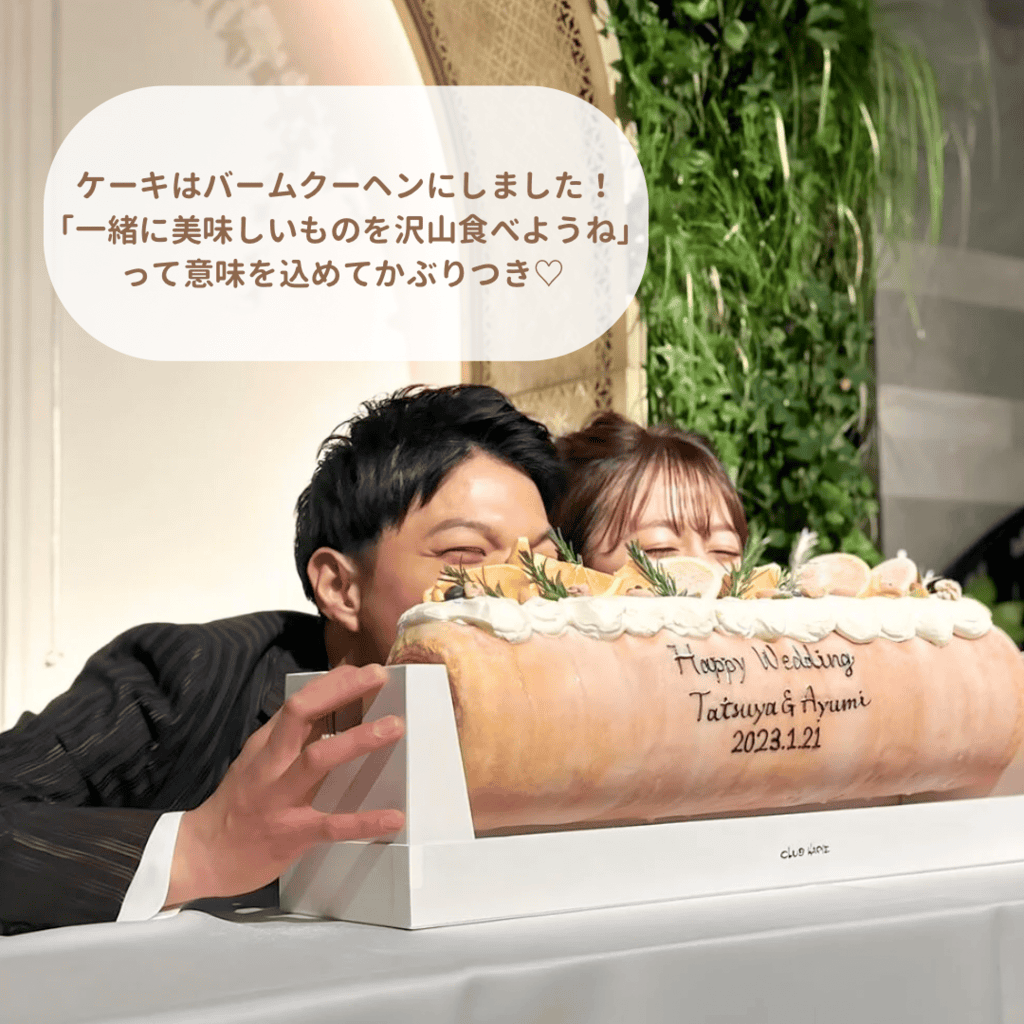 2つ目は、ウェディングケーキの演出について!最近は、ドーナッツやバームクーヘン、お肉などケーキ以外のものを用意する花嫁さんもたくさんいます♡そこで、お二人が選んだこだわりのフードを教えてください*
