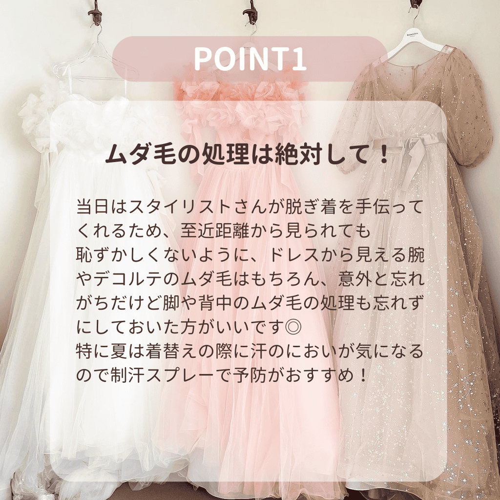 意外と忘れがちなのが、ドレス試着の事前準備。持っていけばよかったものや、スタッフさんに聞いておけばよかったことなど、注意するポイントを教えてください!