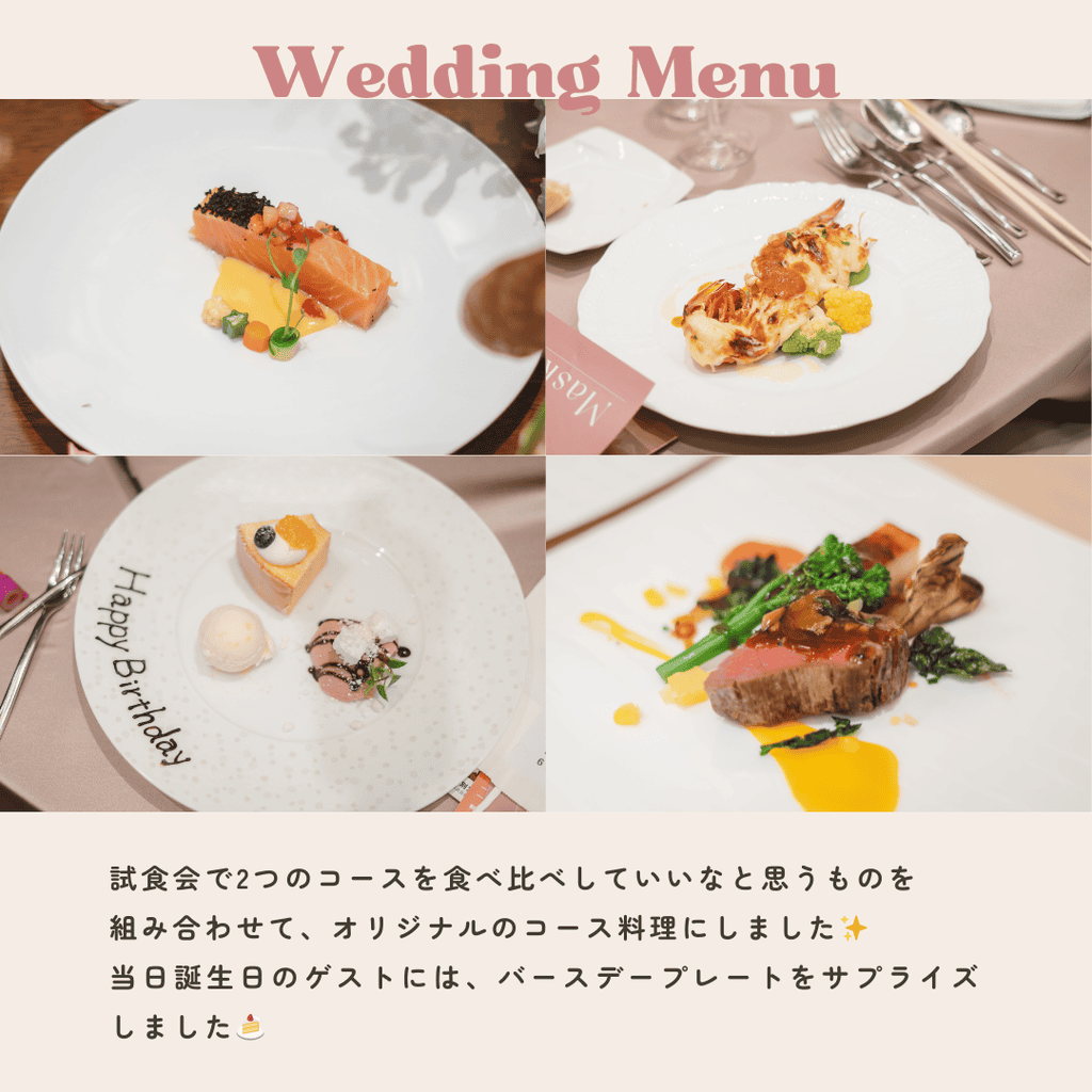 ゲストの満足度も左右する料理は、しっかりと吟味したい結婚式準備の一つ。選んだ料理のメニュー内容や特徴、選んだ理由、そしてゲストからの感想などを教えてください!