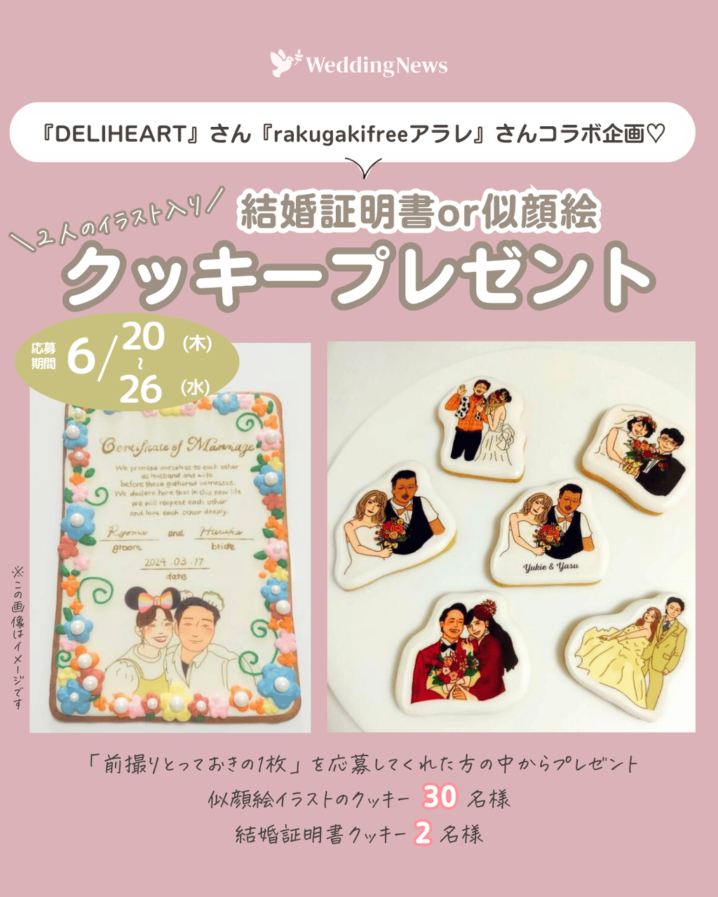 応募していただいた方の中から、似顔絵イラストのクッキーが30名様に、結婚証明書クッキーが2名様に当たるキャンペーンを実施いたします*