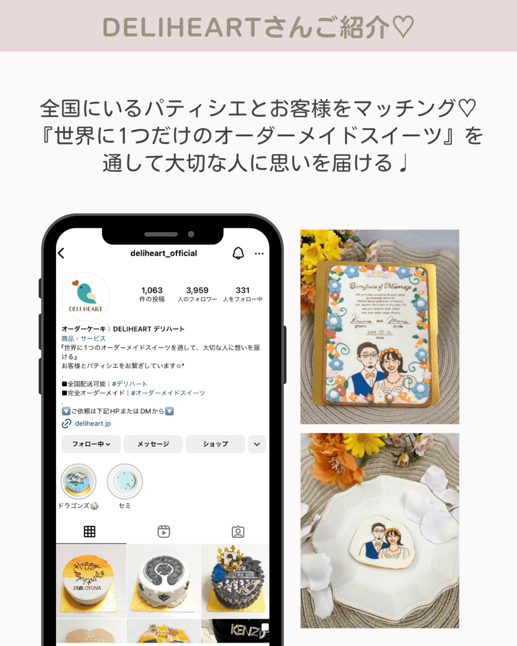 DELIHEARTさんは、世界にいるパティシエとお客様をマッチングして、世界に一つだけのオーダーメイドスイーツを届けてくれるサービス。全国へ配送してくれるのも嬉しいポイント♡