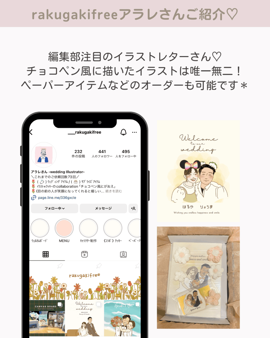 そして、今回似顔絵を書いてくださるのが、たくさんのウェディングアイテムを手がける人気のイラストレーターさんのrakugakifreeアラレさんです♡