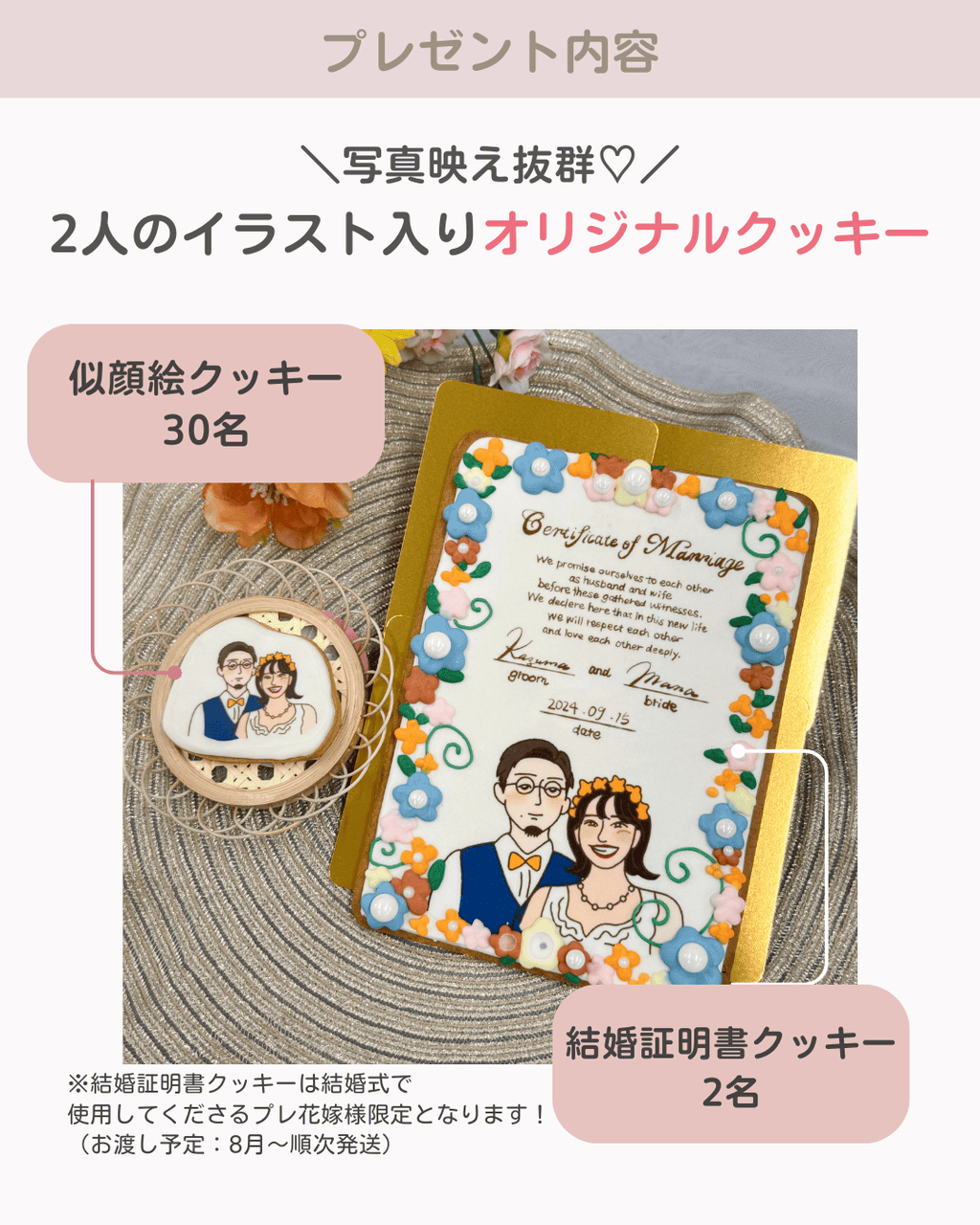 今回のプレゼントは、お二人の似顔絵が書かれたクッキーと結婚証明書クッキーの2種類。