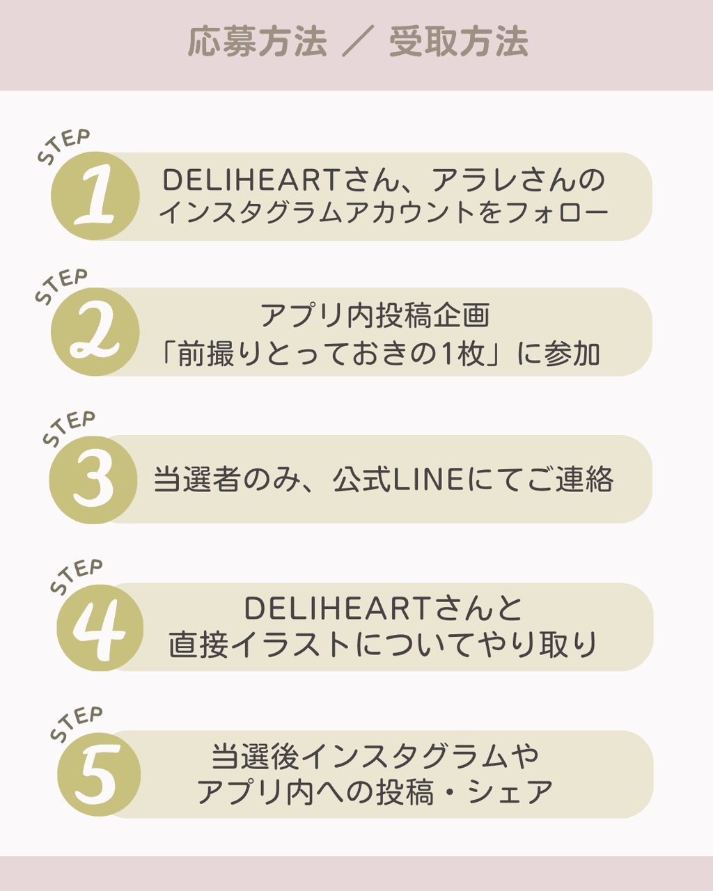 応募いただいた方の中から当選者の方のみ、ウェディングニュース編集部から公式LINEにてご連絡いたします!確認事項などの連絡が完了したらDELIHEARTさんとやりとりをしていただき、依頼から受け取りまでお願いいたします。