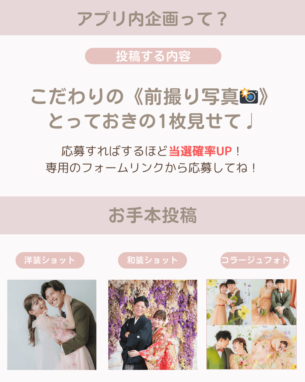 投稿した分だけ当選確率がUPするので、たくさんの前撮り写真を使って応募してください♡