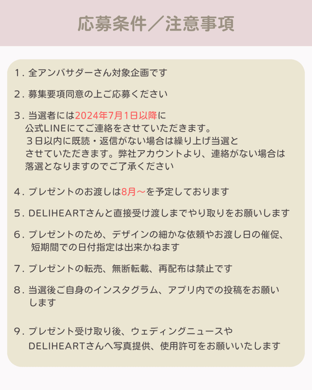 ③当選者の方のみ2024年7月1日以降に公式LINEにてご連絡いたします。3日以内に既読・返信がない場合は、繰り上げ当選とさせていただきますので予めご了承くださいませ。また、弊社より連絡がない場合は落選となります。